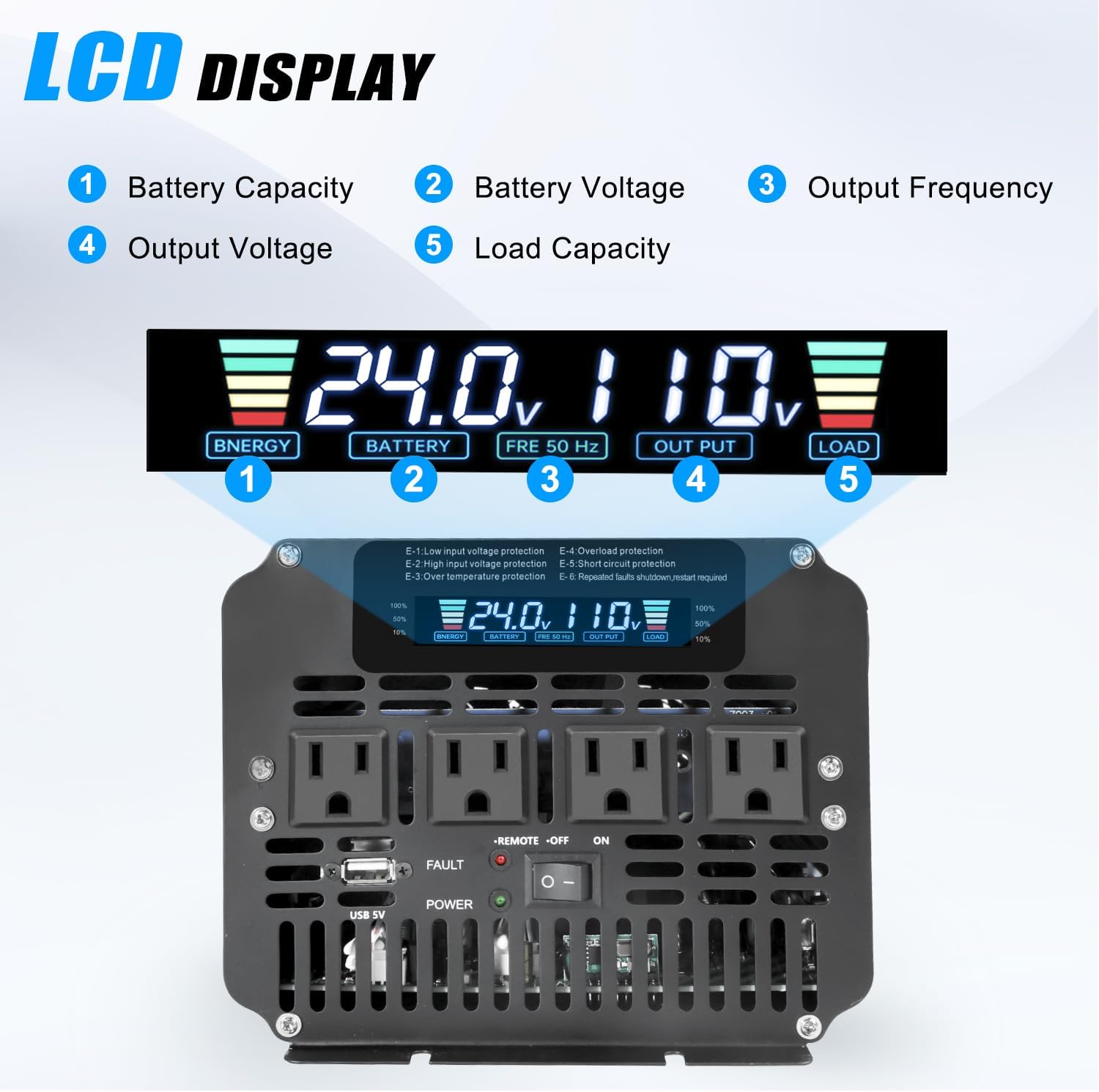 - Intelligent LCD Display: Clear LCD screen displays battery voltage, output voltage, remaining battery capacity, inverter load percentage, error codes, and more.