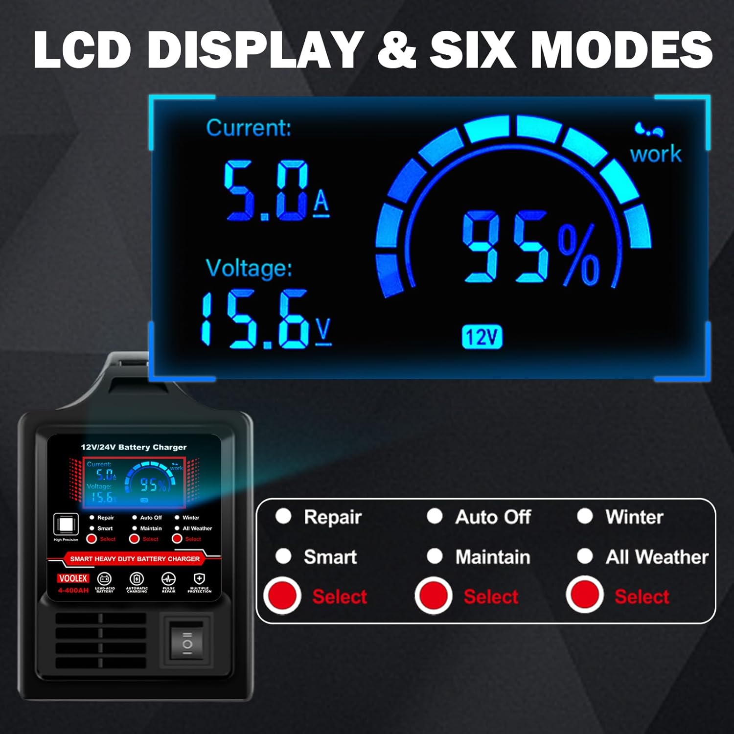 - Winter Mode and All Weather : The 12 volt battery charger automatically regulates charging power (current/voltage) based on real-time battery temperature data.Starts with a reduced charging rate in extreme cold, then gradually increases power as the battery warms up for a balance of speed and safety.