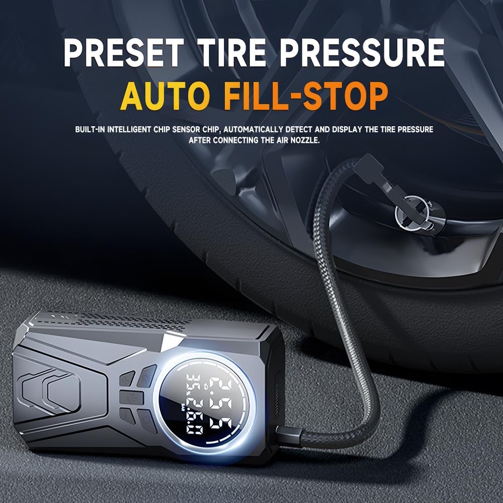 - STARTER WITH AIR COMPRESSOR UNIT: This car tire inflator has a massive 150PSI of pressure and is often the most commonly used piece of electrical equipment in a car. The portable air pump's high-quality air cylinder delivers a fast 20L/Min inflation, which can inflate tires from 32PSI to 36PSI in just one minute