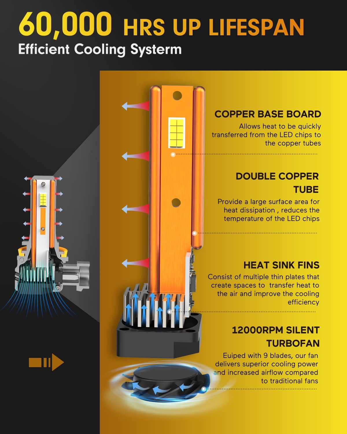 - 【10+ Years Longer Lifespan】Built with premium aviation-grade aluminum and an advanced copper cooling system, Fahren H11 9005 bulbs deliver unmatched durability. Equipped with a high-performance cooling fan, these bulbs maintain optimal temperature for maximum efficiency and longevity. Enjoy a remarkable 70,000-hour lifespan – that's over a decade of brilliant, maintenance-free lighting for your vehicle.