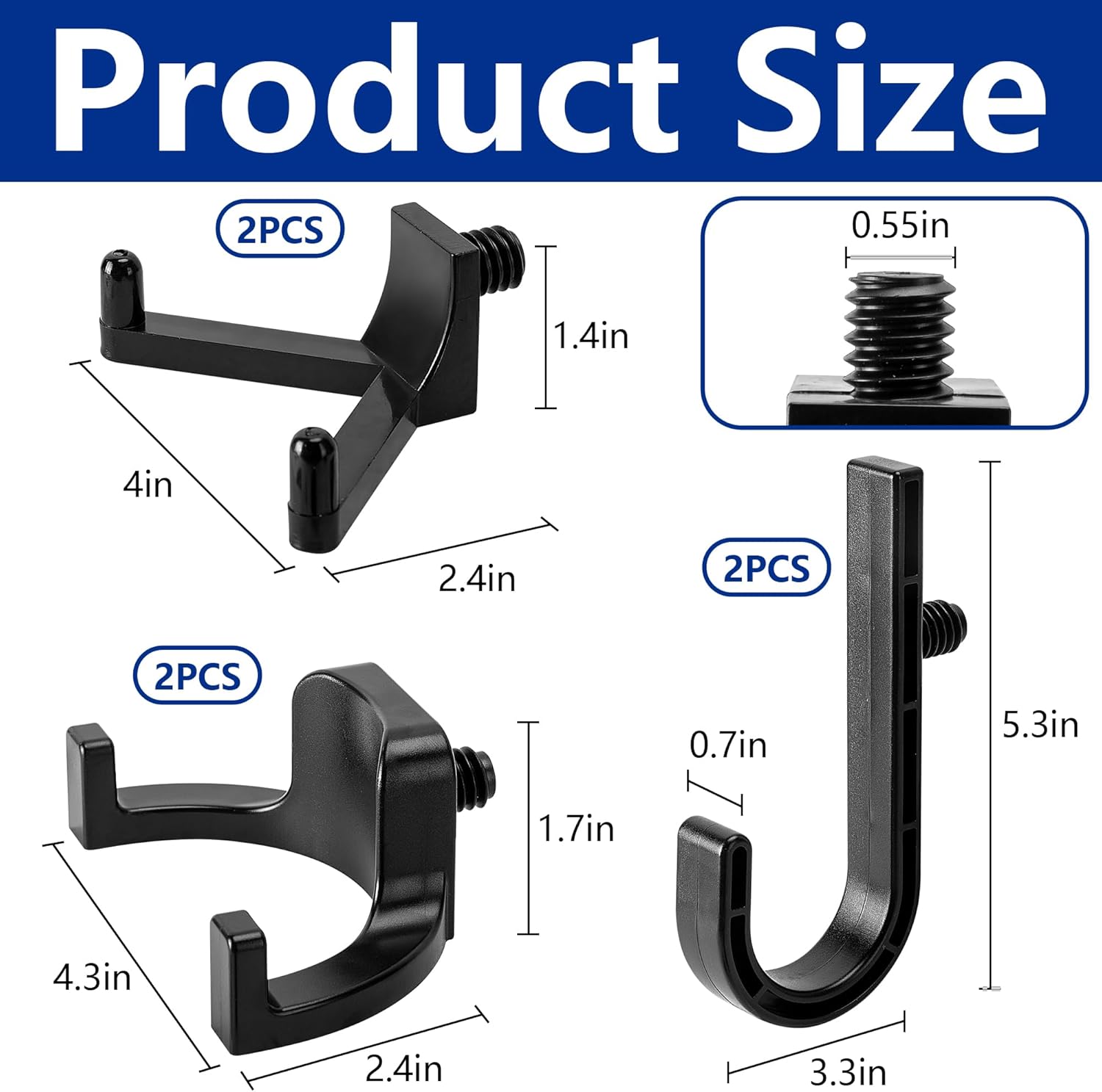- Size Information:J-hooks measure approximately 5.3x3.3x0.7 inches, U-hooks measure approximately 4.3x2.4x1.7 inches, and V-hooks measure approximately 4x2.4x1.4 inches. The diameter of the mounting part is 0.55 inches, please check the size carefully before purchasing.