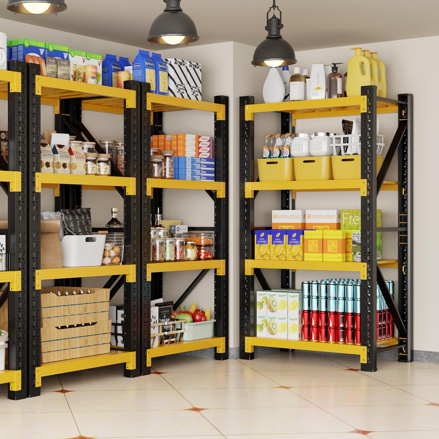 - 3000 LBS Heavy Duty Garage Shelving: Our garage shelving are made of all-metal and feature a triangular mechanical design at both ends to enhance stability. The garage shelves are connected by screws and lock pins. There are multiple reinforcing ribs on the back of the metal shelving, which greatly enhance the load-bearing capacity. The total load capacity of the garage shelf unit is 3,000 pounds. It is very suitable for storing heavy objects such as tires, generators, and oil tanks.