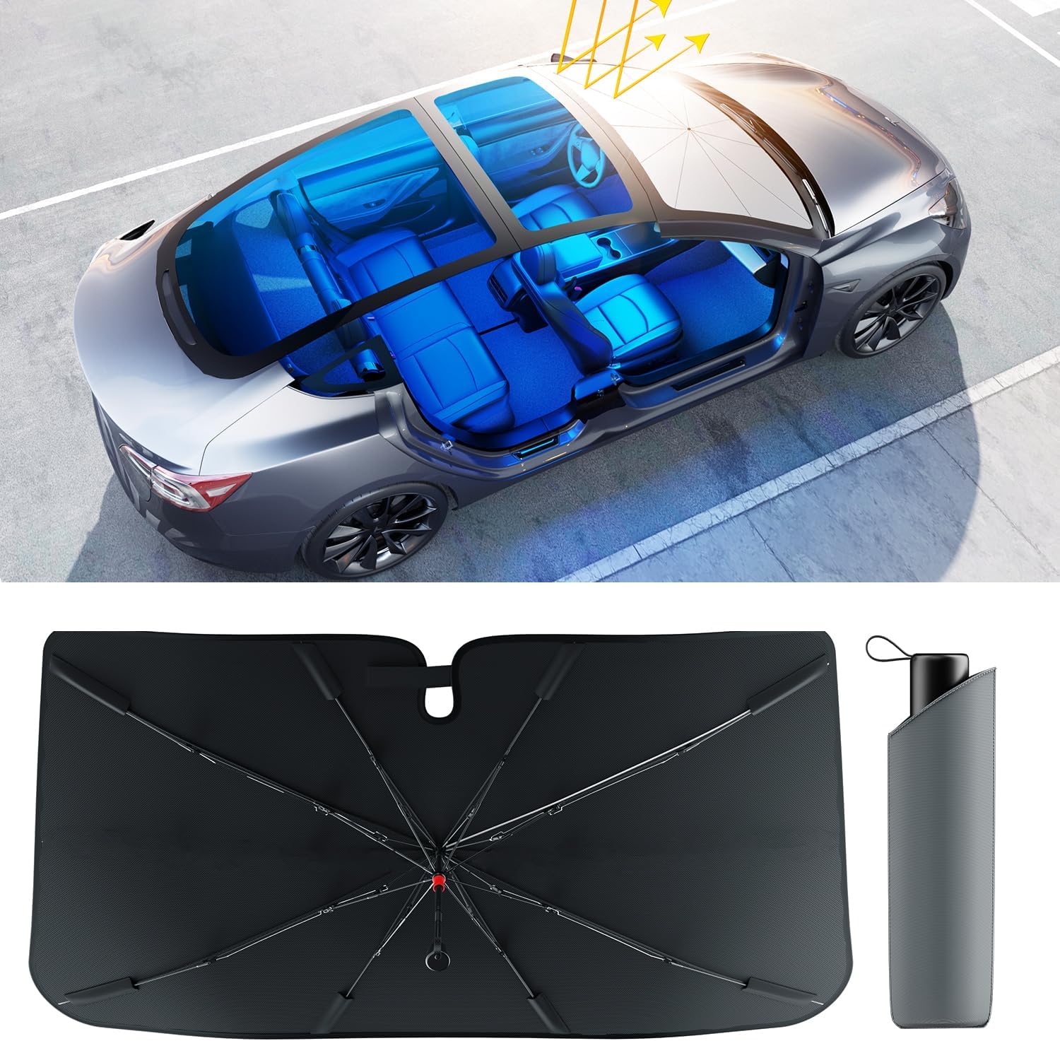 - [2025 Updated Version] - Combine double-layer cooling Sik material with reflective Vinyl Coating to achieve 0%-transmittance and efficient cooling of the product. Creating the better driving experience for you on summer. Whether you are on vacation, going to the beach, going to work, going to school, or going anywhere, You can rest-assured to park anywhere outdoors. Because our umbrella sunshade for car windshield can effectively protect your car from the sun and keep your car cool.
