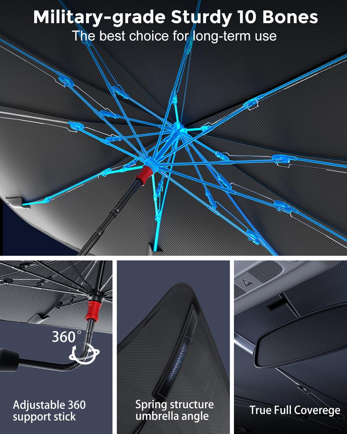 - [Military-Grade Fiberglass Skeleton & Design] - The special material has ultra-durability. In addition, we have integrated spring structures at the edges and ribs of the umbrella, enhancing flexibility and ensuring your car's interior remains unscathed. This addition makes our sunshade more adaptable and durable than ever before, providing a reliable shield against the elements.