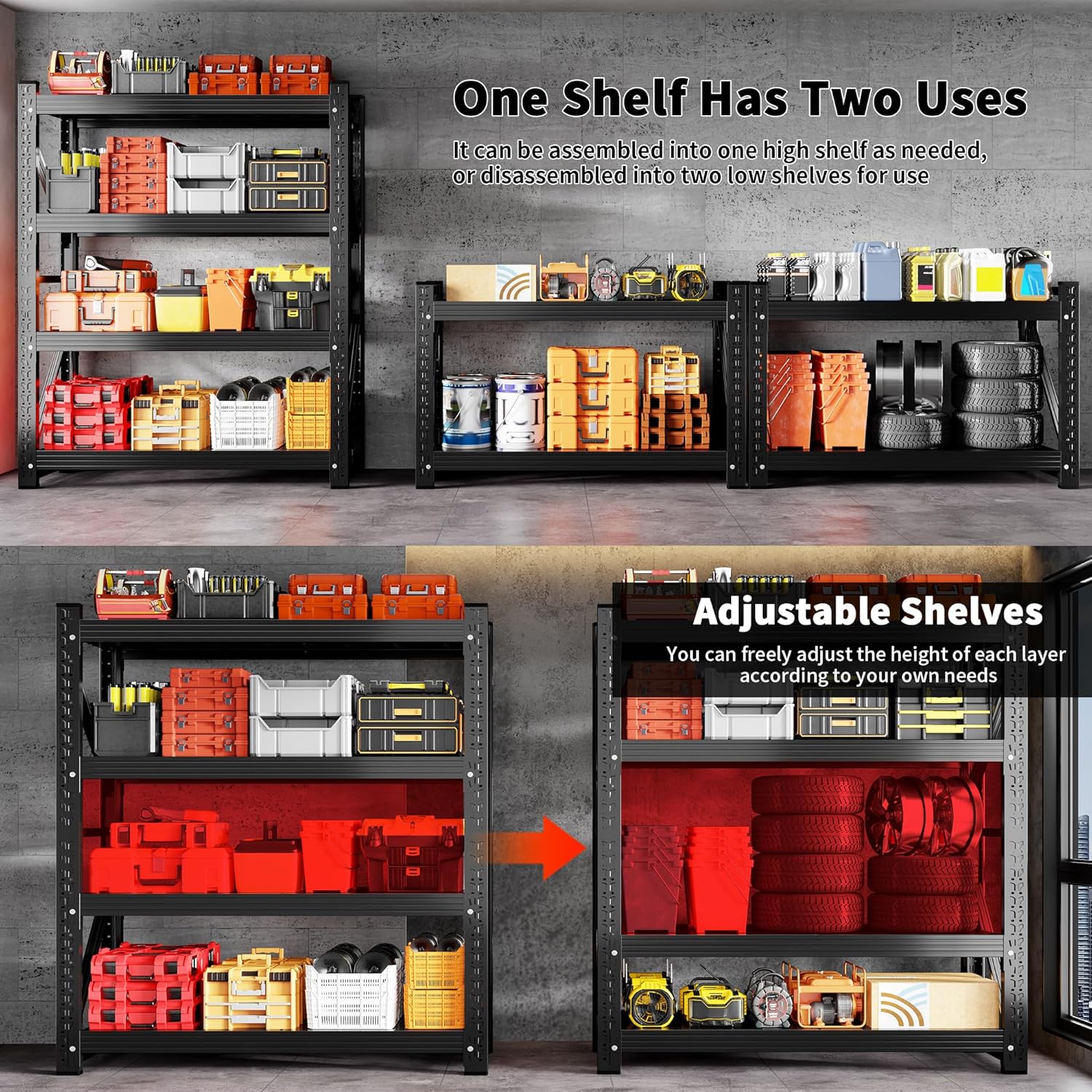 - 5000 LBS Heavy Duty Garage Shelving: Our Garage Storage Shelves are made of all-metal and feature a triangular mechanical design at both ends to enhance stability. The garage shelves are connected by screws and lock pins. There are multiple reinforcing ribs on the back of the metal shelving, which greatly enhance the load-bearing capacity. The total load capacity of the garage shelf unit is 5,000 pounds. It is very suitable for storing heavy objects such as tires, generators, and oil tanks.