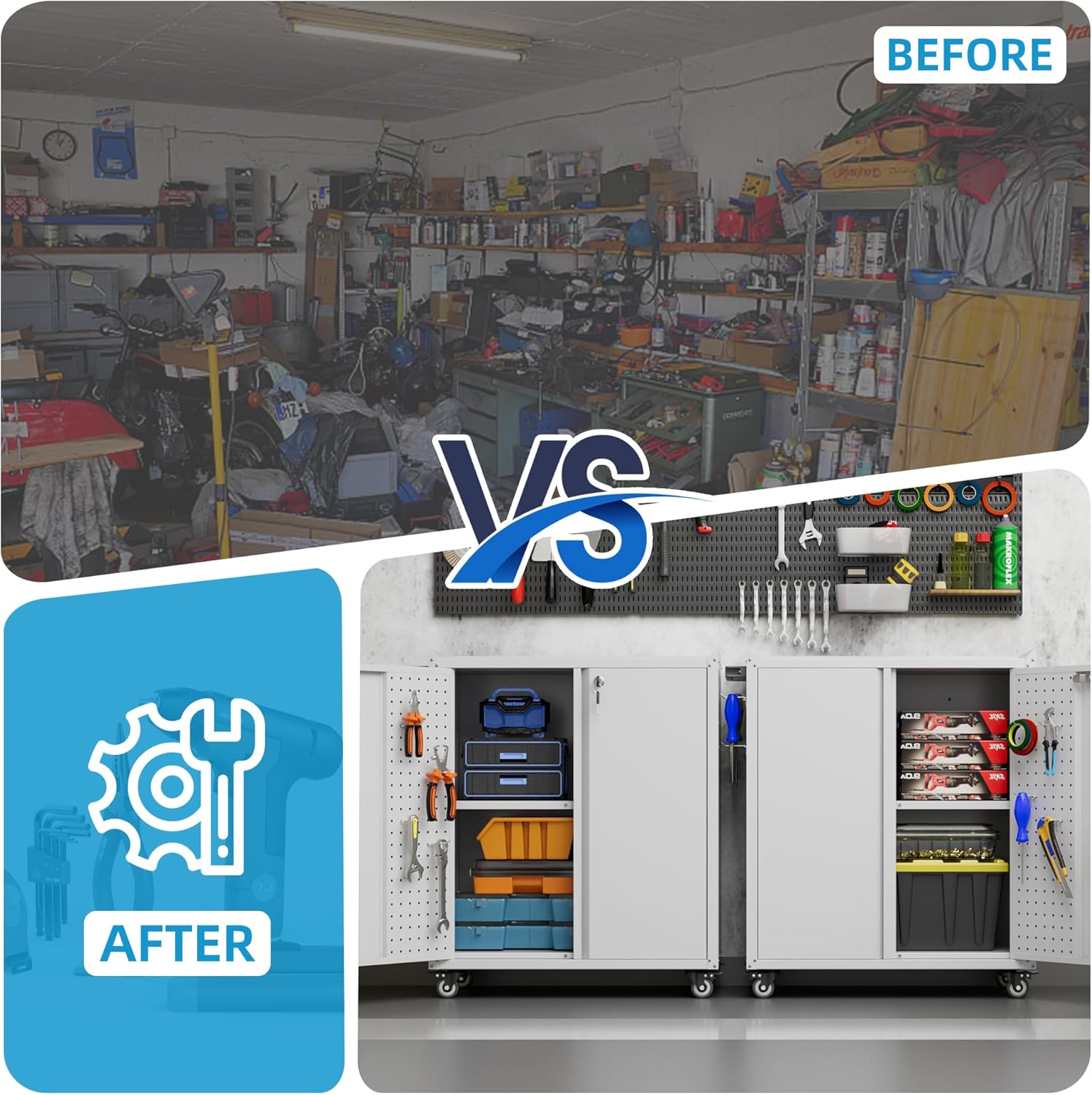 - Industrial-Grade Durability & Rust-Proof Protection:Crafted from heavy-duty cold-rolled steel, this garage cabinet withstands up to 100 lbs of weight—perfect for bulky tools, power equipment, or automotive supplies. Features eco-friendly powder coating for superior resistance to rust, moisture, and garage chemicals. Built to survive harsh environments, from humid basements to dusty workshops.