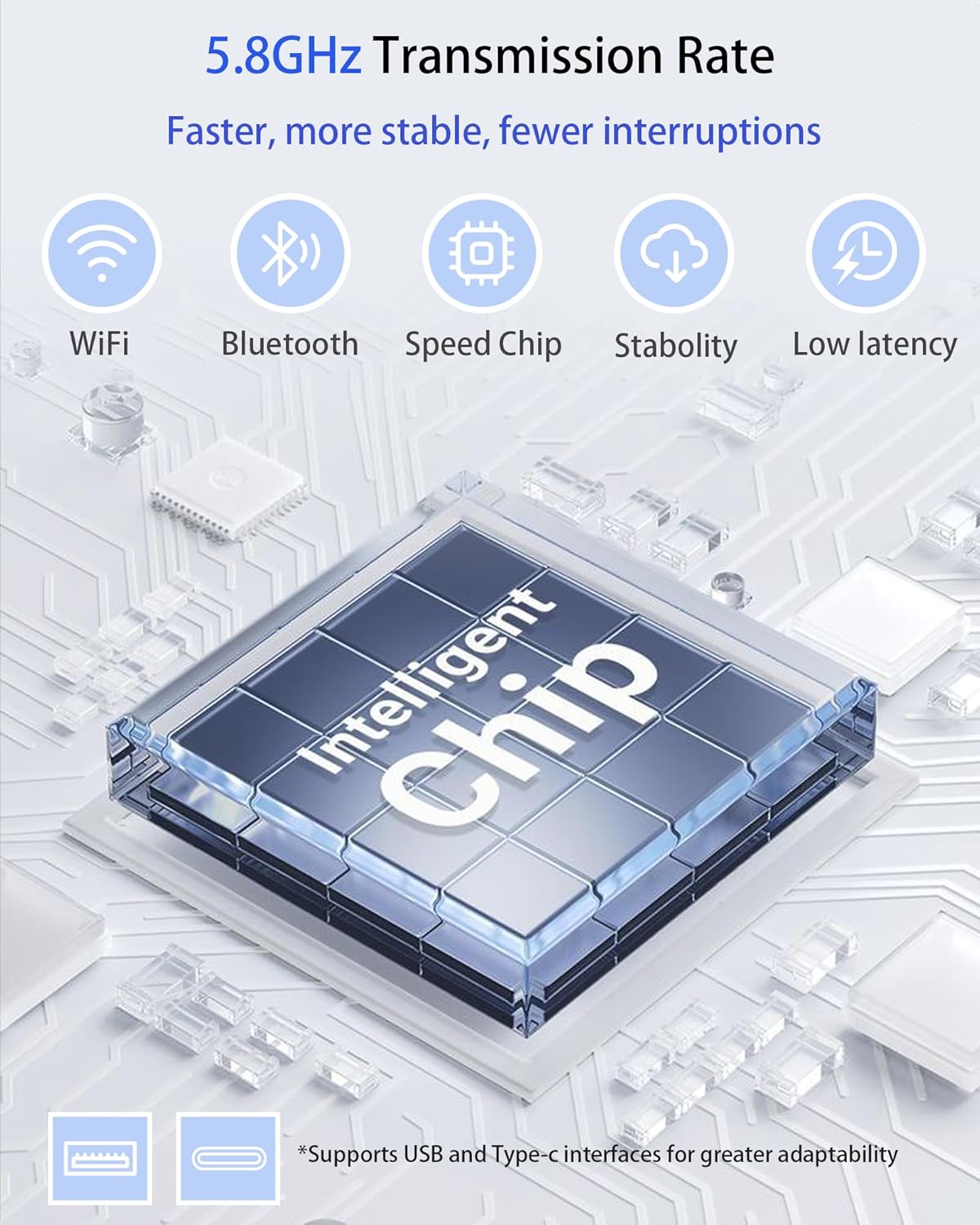 - 🚗【5.8GHz High-Speed WiFi + Bluetooth 5.3 | Ultra-Fast Response | Truly Wireless Experience】 The 2025 upgraded wireless CarPlay adapter is equipped with a 5.8GHz dual-band WiFi chip and Bluetooth 5.3 high-speed transmission protocol, ensuring ultra-fast, millisecond-level response with stable and lag-free data transmission. Say goodbye to cable clutter with ease. Compatible with both Apple CarPlay and Android Auto, making your driving smarter and more convenient. (*Your car must support wired CarPlay/Android Auto.)