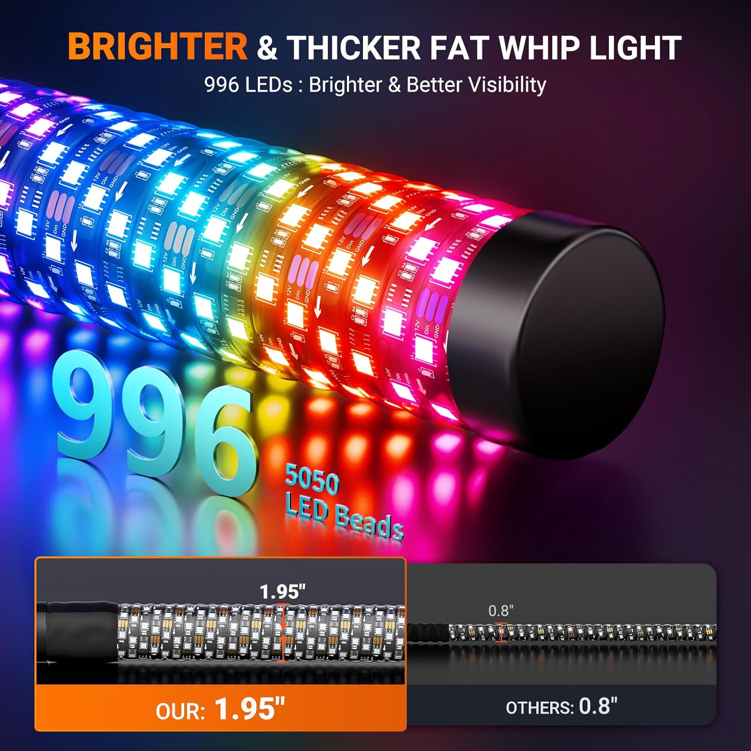 - ăUPGRADED 1.95 IN DIA and BrighterăEhaho 4FT Fat Whip Lights pack 600 RGB LEDs using the latest 5050 RGB LED chips. These LED Fat Whip Lights are three times brighter and more visible, even in daylight. Featuring a smaller gap and the tightest coiled spiral design, these Fat LED Whips glow in a 360° direction, delivering brighter and more uniform colors