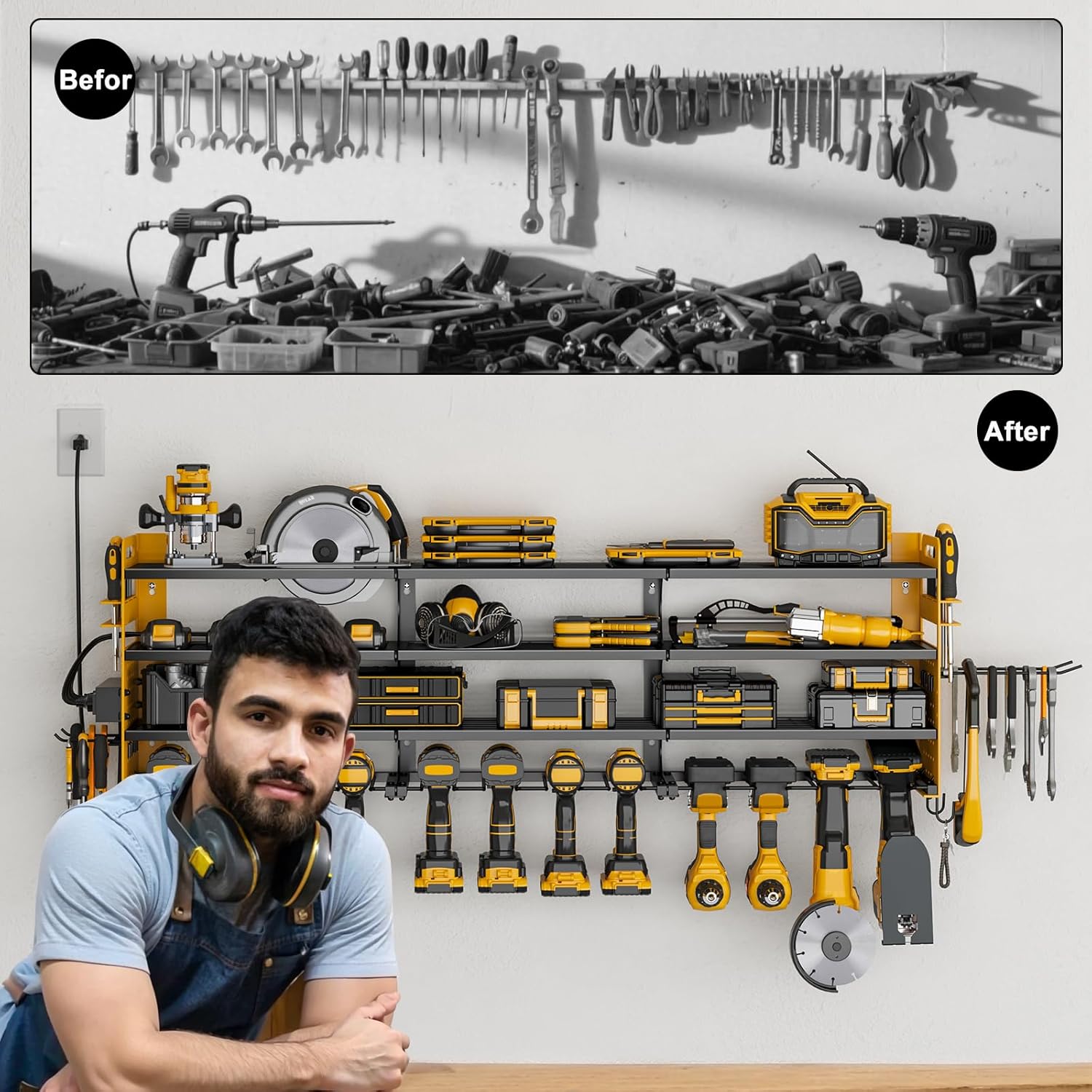 - Customizable Design: The 4-hole power strip can be mounted on either side for convenience, and the adjustable shelves give you full flexibility to organize your tools the way you want