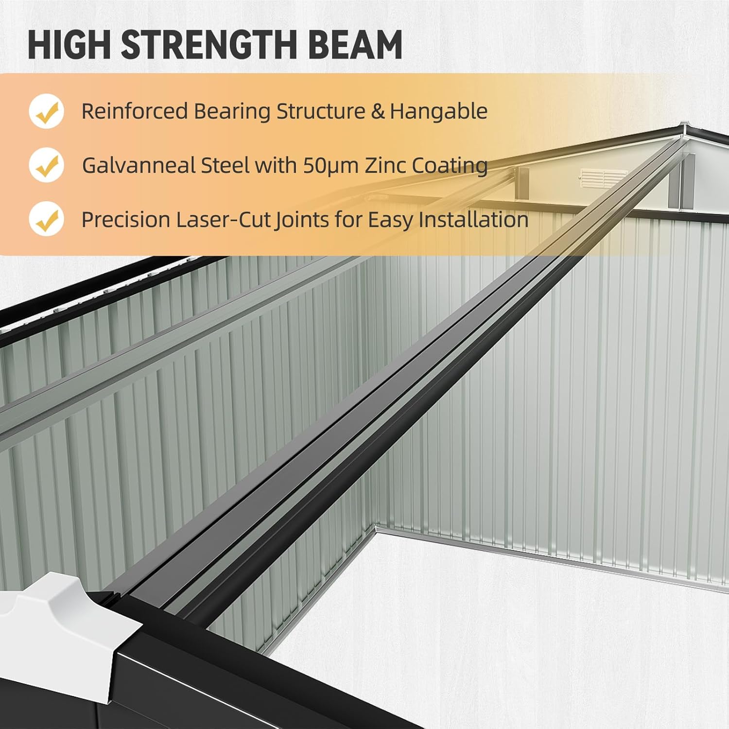 - Quality Floor Frame & Galvanized Steel Construction: Crafted with thick galvanized steel panels and reinforced structural engineering, this metal shed delivers exceptional durability. The anti-rust powder-coated surface combined with a 15mm interlocking plastic floor (woodgrain texture) ensures 360Β° moisture resistance while maintaining floor flatness. In addition, the floor supports a load-bearing capacity of 82 pounds per cubic foot, making it easy to hold heavy machinery
