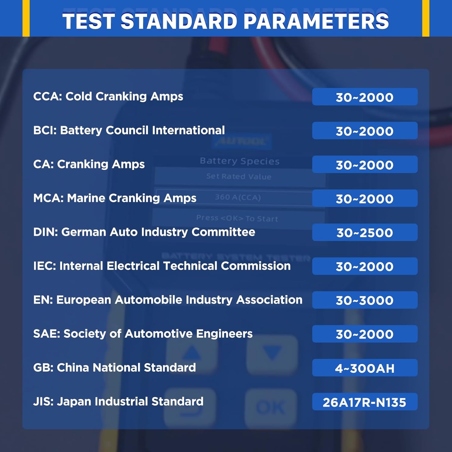 - 【Accurate and Fast Detection】BT360 battery load tester adopts advanced conductivity testing technology, which can quickly and accurately measure the cold cranking current (CCA), state of health (SOH) and state of charge (SOC) of automotive batteries, and supports a wide range of battery types including ordinary lead-acid batteries, AGM flat/spiral batteries, GEL, EFB, etc., covering a range of 30-2000CCA, and efficiently locating faults.