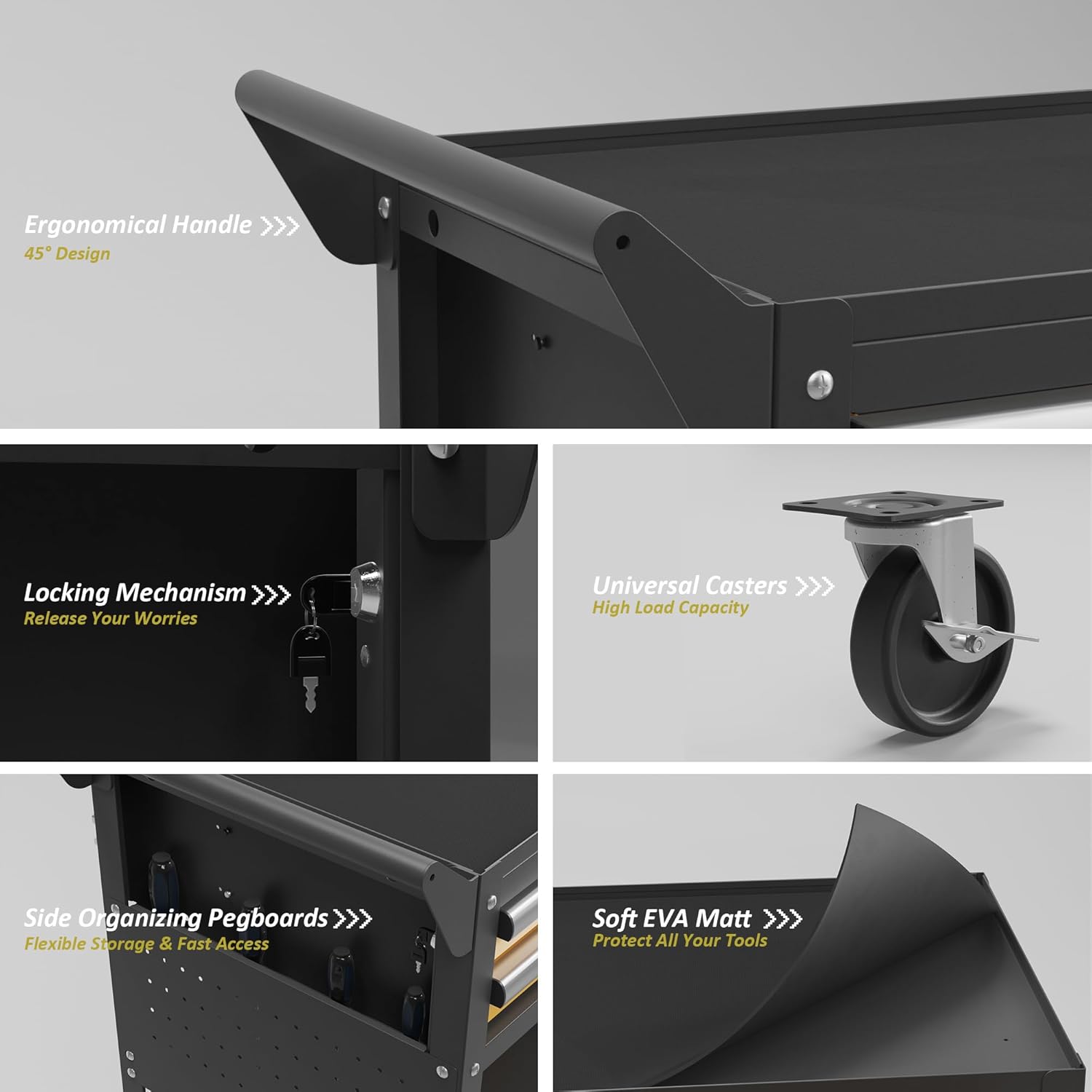 - Industrial Grade Steel:β Crafted from high-quality cold-rolled steel with a rust-resistant coating, our mechanic tool cart ensures exceptional durability. As a robust power tool organizer cart and power tool storage rack, it boasts an impressive weight capacity of 400 lbs, making it reliable for heavy-duty tasks.