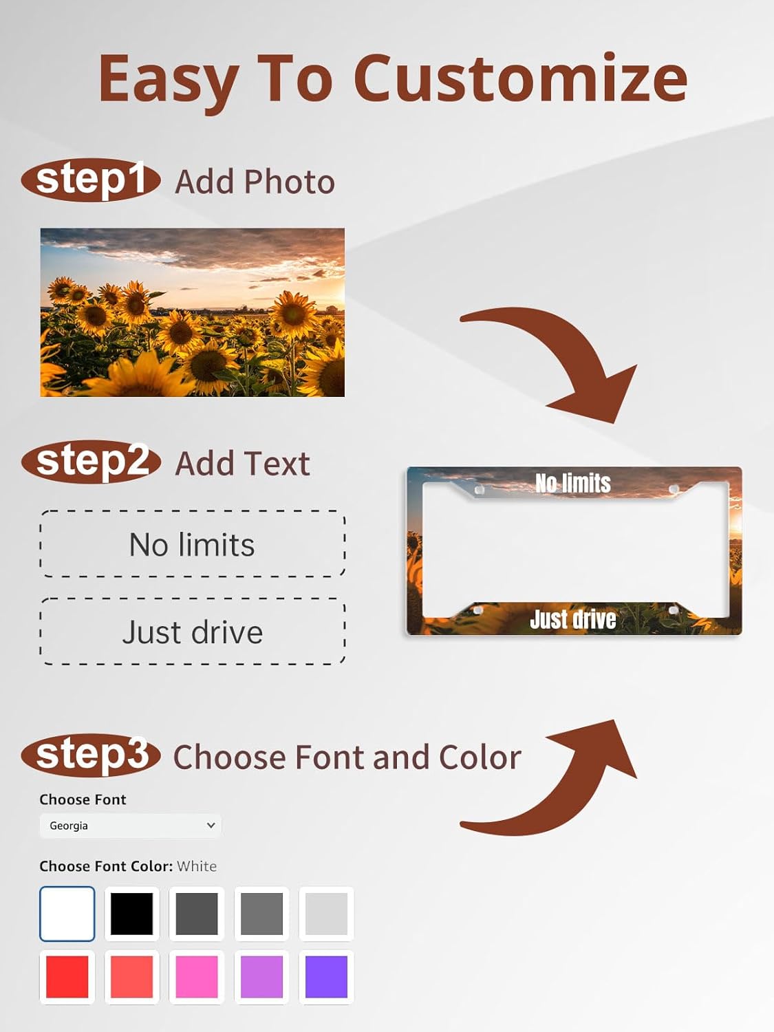 - 【Guide To Customizing license plate frame】: Click “Customize Now” to choose a background color or upload a special photo, add your text, and make it yours. Pick a font and color you love—your unique custom license plate frame is just a few clicks away. We’ll craft your personalized license plate frame with care, just for you.