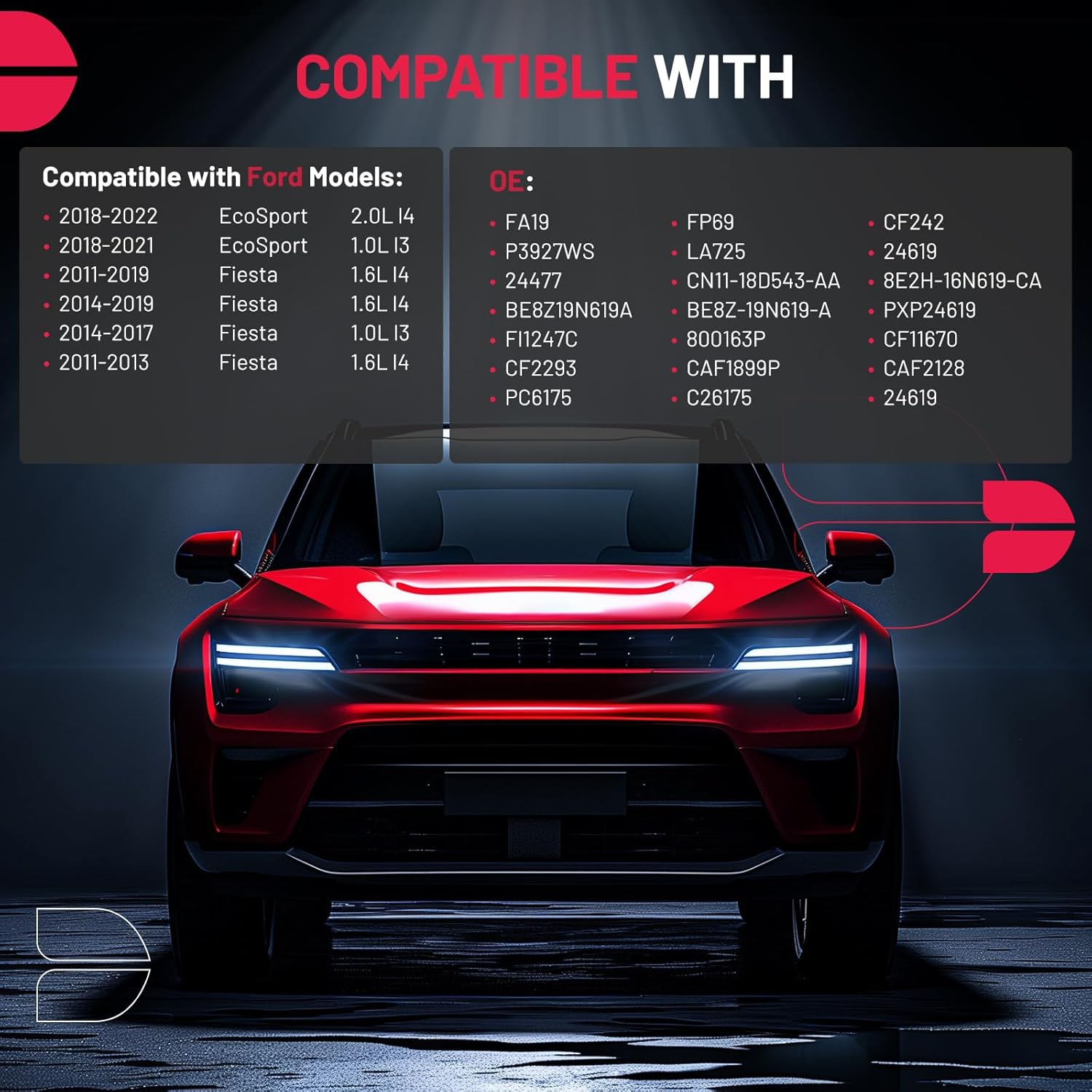 - [Vehicle Fitment] Compatible with Ford Models: 2014-2017 Fiesta 1.0L l3, 2011-2019 Fiesta 1.6L l4, 2018-2022 EcoSport 2.0L l4, 2018-2021 EcoSport 1.0L l3
