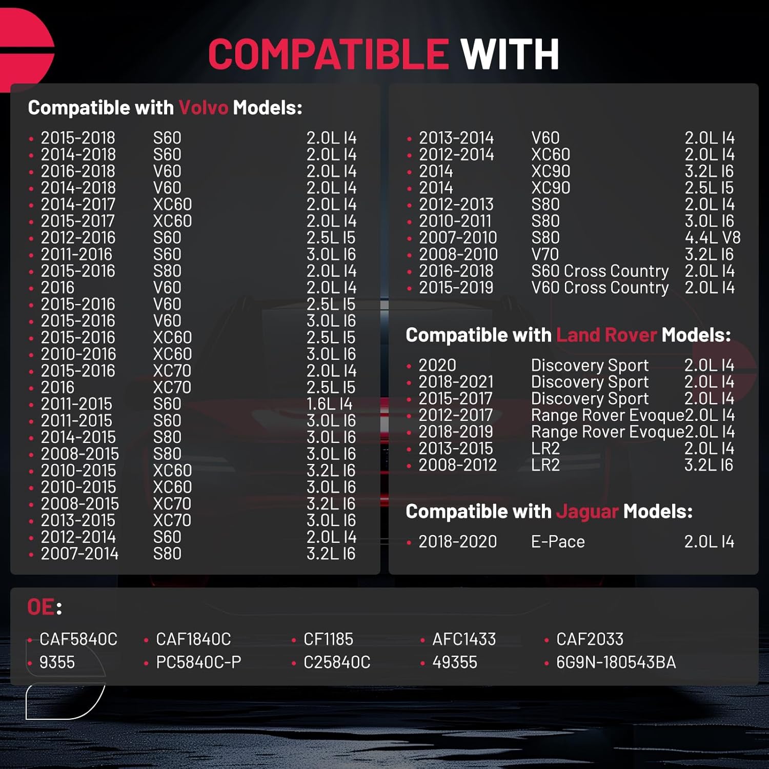 - [Vehicle Fitment] Compatible with Volvo Models: 2011-2018 S60, 2016-2018 S60 Cross Country, 2007-2016 S80, 2013-2018 V60, 2015-2019 V60 Cross Country, 2008-2010 V70, 2010-2017 XC60, 2008-2016 XC70, 2014 XC90; Compatible with Land Rover 2015-2021 Discovery Sport, 2008-2015 LR2, 2012-2019 Range Rover Evoque; Compatible with Jaguar Models: 2018-2020 E-Pace 2.0L l4