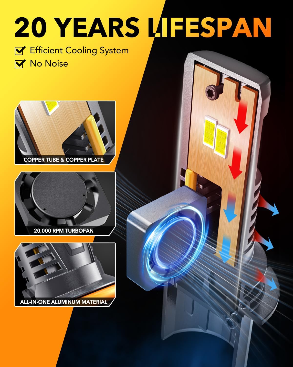 - 【Extended 20 Years Lifespan】 Features aviation-grade aluminum housing with a 20,000 RPM turbo cooling fan and dual copper heat sinks for optimal thermal management and long-lasting performance.