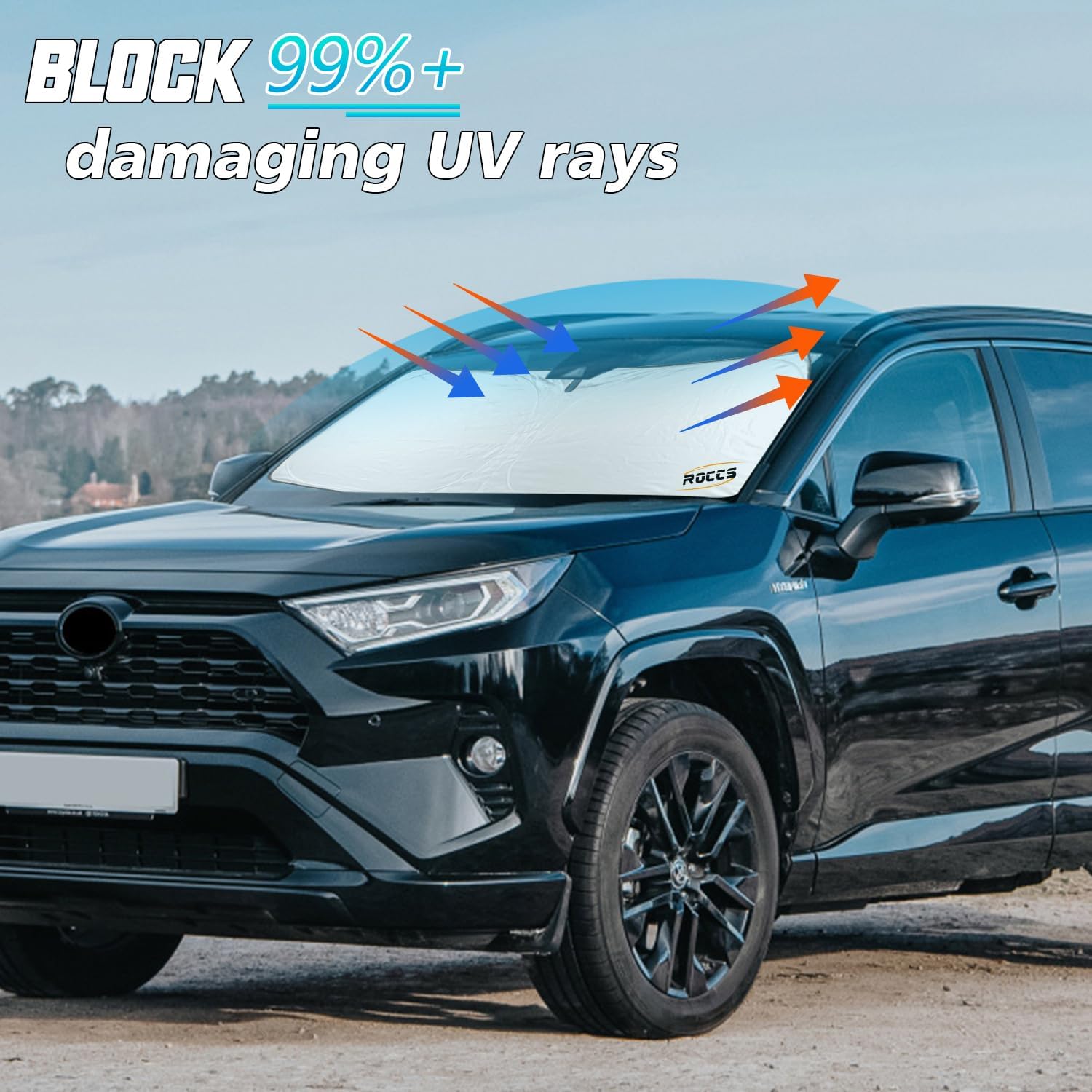 - UV Protective Barrier: ROCCS foldable 4runner sun shade utilizes premium 240T polyester UV-reflective fabric to effectively block 100% of harmful UV rays and solar heat radiation, safeguarding your dashboard, steering wheel, and leather seats from sun-induced fading and cracking.