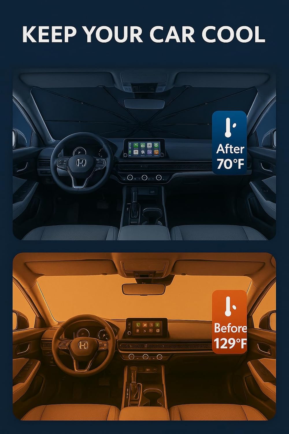 - Certified Sustainable. Customized Windshield Sunshade: Specially designed for the 2023-2025 Honda Accord with precise mirror cutouts, providing 100% shading, carbon fiber handle, ensuring lightweight and durability while also having a fashionable feel. Our Accord windshield sunshade can protect the interior of your car from various light damage and prevent dashboard and seat degradation.