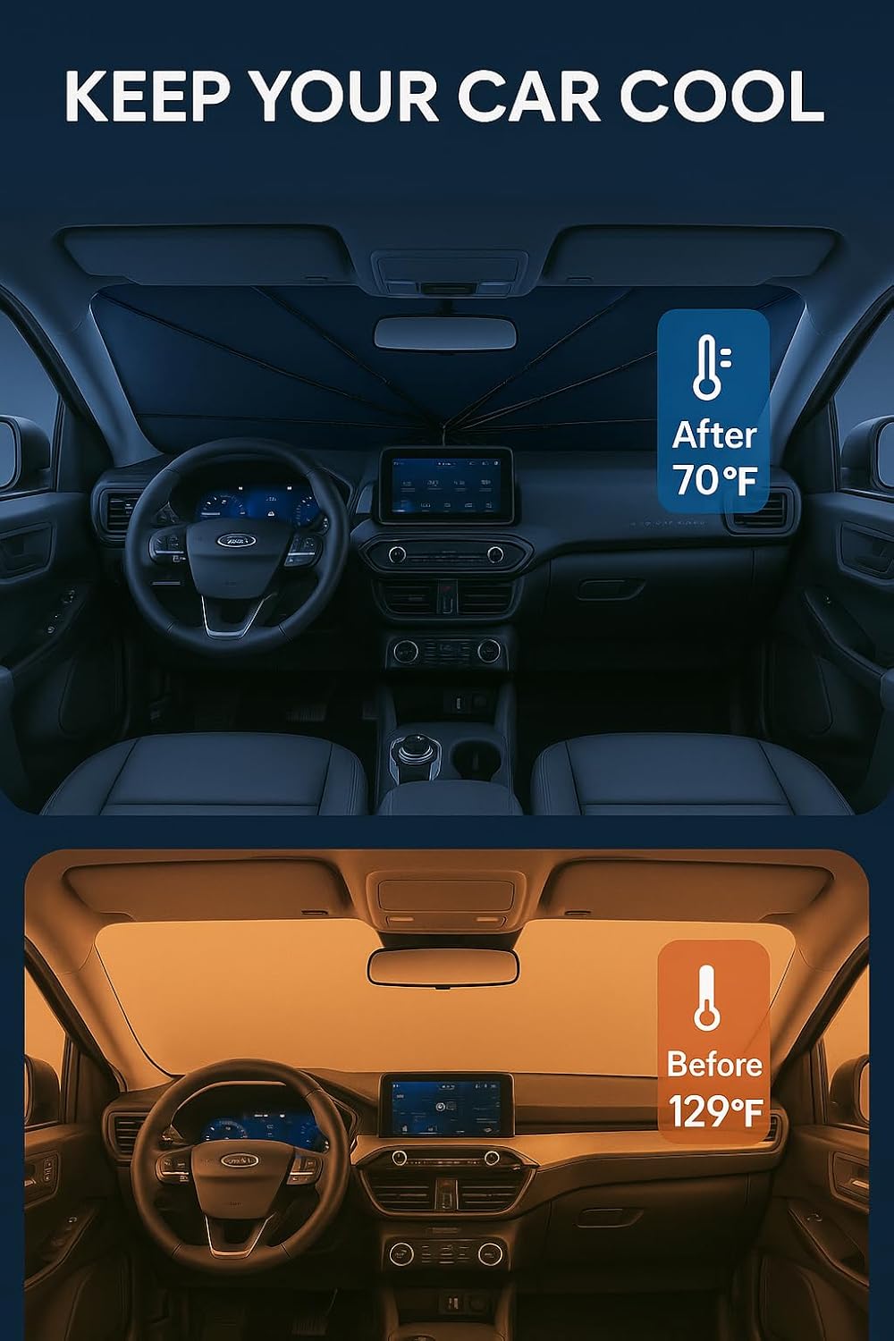 - Innovative Ice Crystal Material: The sunshade adopts a 4-layer design, which is thick enough to effectively block and reflect sunlight. After multiple uses, it is still strong and not easy to tear. The sunshade also uses innovative ice crystal materials to evenly distribute heat, quickly cool down, and keep your car cool all the time. You no longer have to worry about getting your seat or car handle scalded by high temperatures.