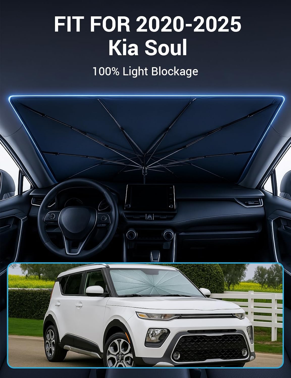 - Certified Sustainable. Customized Windshield Sunshade: Specially designed for the 2020-2025 Kia Soul with precise mirror cutouts, providing 100% shading, carbon fiber handle, ensuring lightweight and durability while also having a fashionable feel. Our Soul windshield sunshade can protect the interior of your car from various light damage and prevent dashboard and seat degradation.