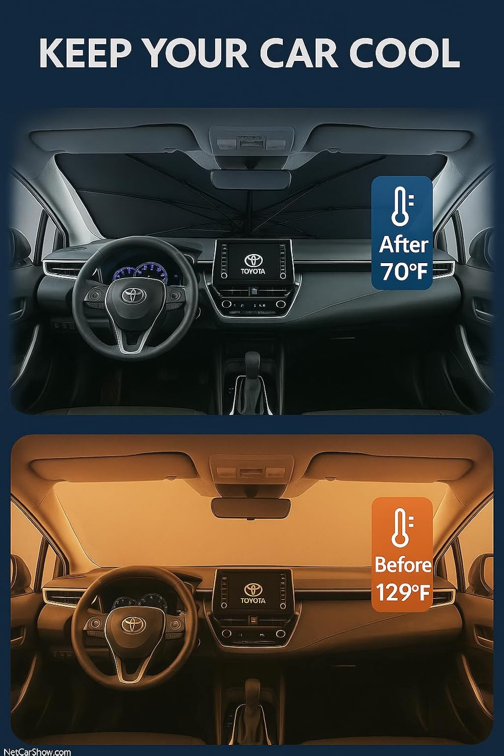 - Certified Sustainable. Customized Windshield Sunshade: Specially designed for the 2022-2025 Toyota Corolla Cross with precise mirror cutouts, providing 100% shading, carbon fiber handle, ensuring lightweight and durability while also having a fashionable feel. Our Corolla Cross windshield sunshade can protect the interior of your car from various light damage and prevent dashboard and seat degradation.