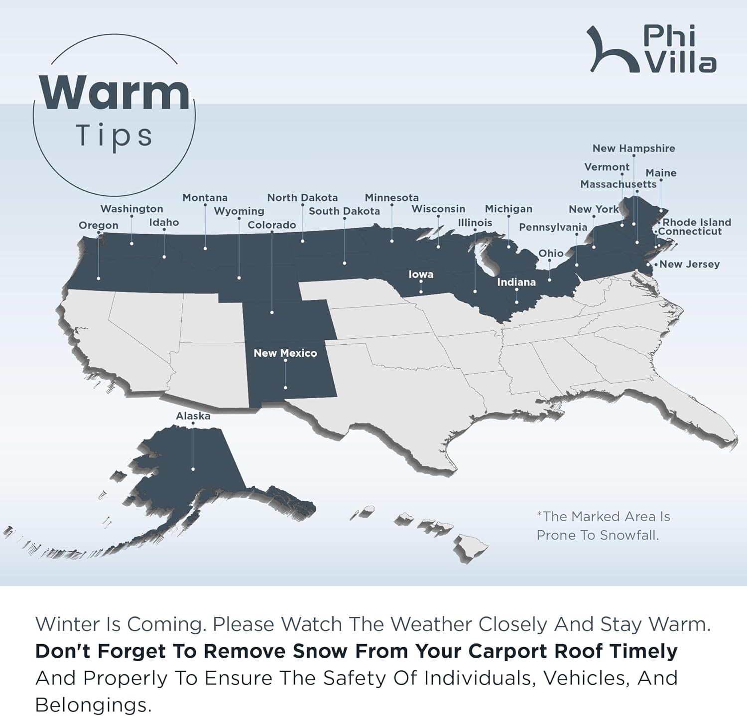 - To ensure that your carport is safe and secure, it is recommended that you clear snow on a reqular basis to avoid the effects of excessive snow on the structure. This not only extends the life of the product, but also keeps your vehicle in good condition at all times.
