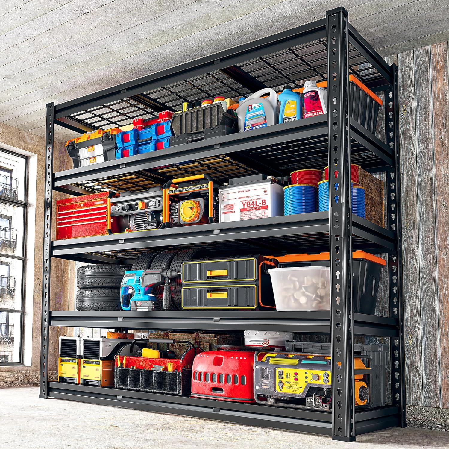 - ă48"W x 72"H x 18"D Super Wide Garage ShelvingăThis 5 tier garage storage shelves is 48 inches wide, giving you plenty of extra space to store more items or boxes.This metal storage shelves is a top-notch choice for keeping your garage, utility room, or basement organized, and itâs versatile enough for commercial use too
