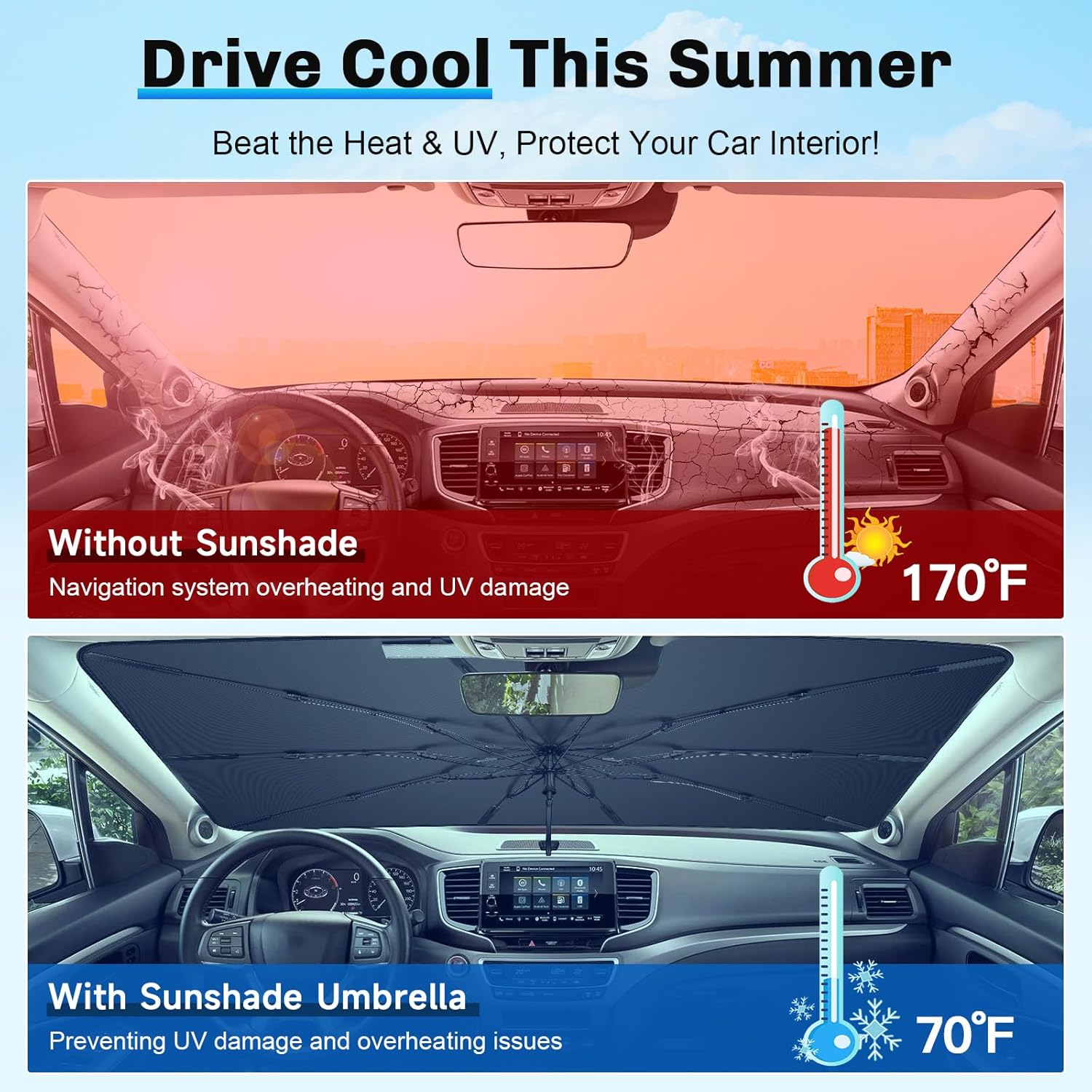 - 1. Sun & Heat Insulation: Windshield Umbrella Sunshade for 2017-2025 Honda Ridgeline Accessories, 99.9% UV protection, upgraded wrinkle-resistant fabric reflects heat, keeps car cool. Protects interior from fading & cracking, ensuring comfort on hottest days
