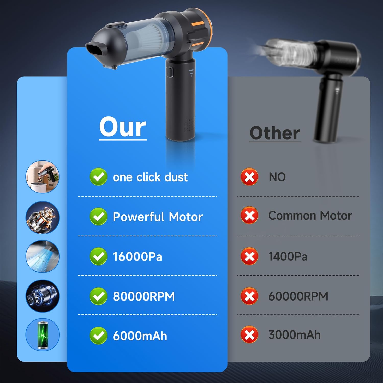 Portable Cordless Mini Car Vacuum Cleaner 16KPa - 80000RPM Brushless Motor Handheld 4-in-1 Compressed Air Duster & Air Blower & Pump Hand Held Vacuum for Car, Home, Office, Camping, Pet