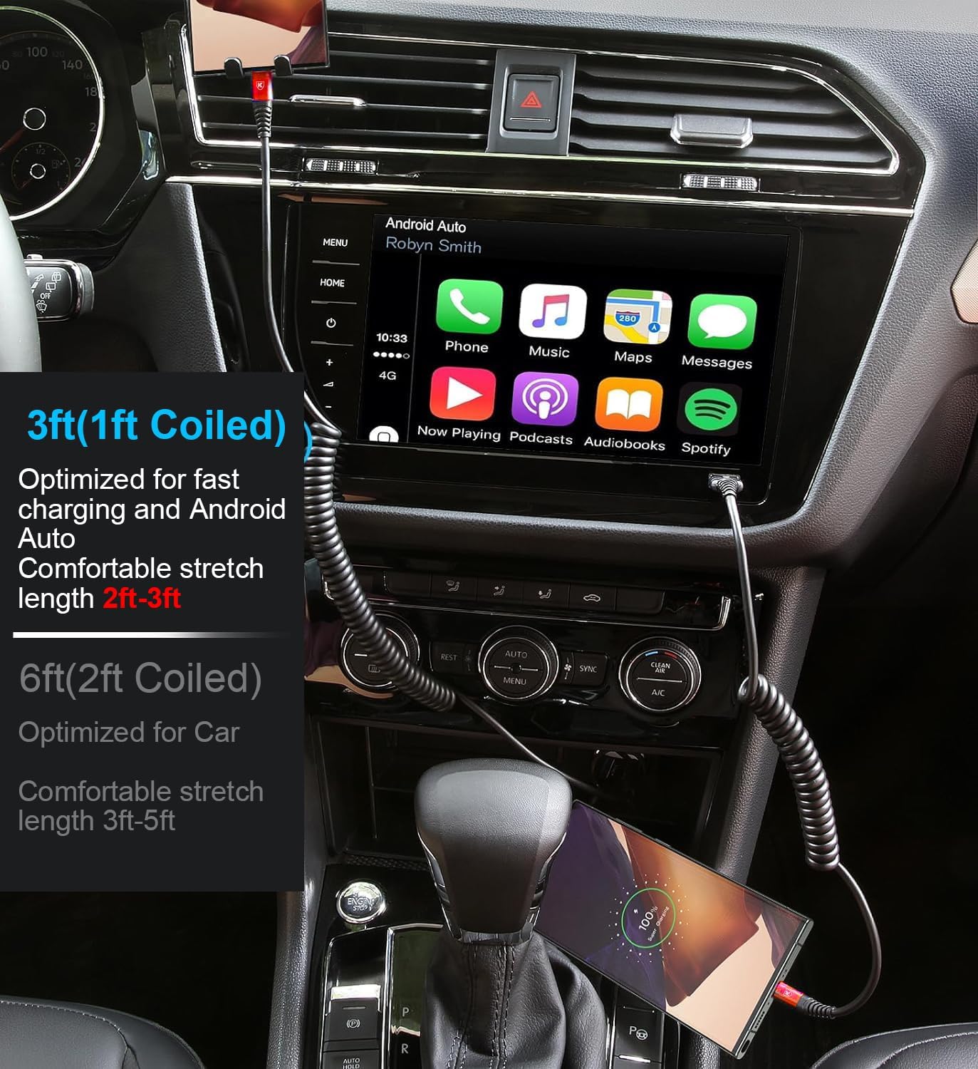 - Elastic Coiled USB C Cable : Retractable USB C to USB C cable 1FT (stretchable to 3FT, comfortable stetch length 1.5ft-2ft) coiled Type C cable 2FT (stretchable to 6FT, comfortable stetch length 3.5ft-4ft) and bounce back to normal length. If you use it in the front seat of your car and store your device in a compartment, we recommend 3 feet; if you use your device in the back seat of your car, you can choose 6 feet.USBC charging cable 3ft and 6ft can meet your different needs.