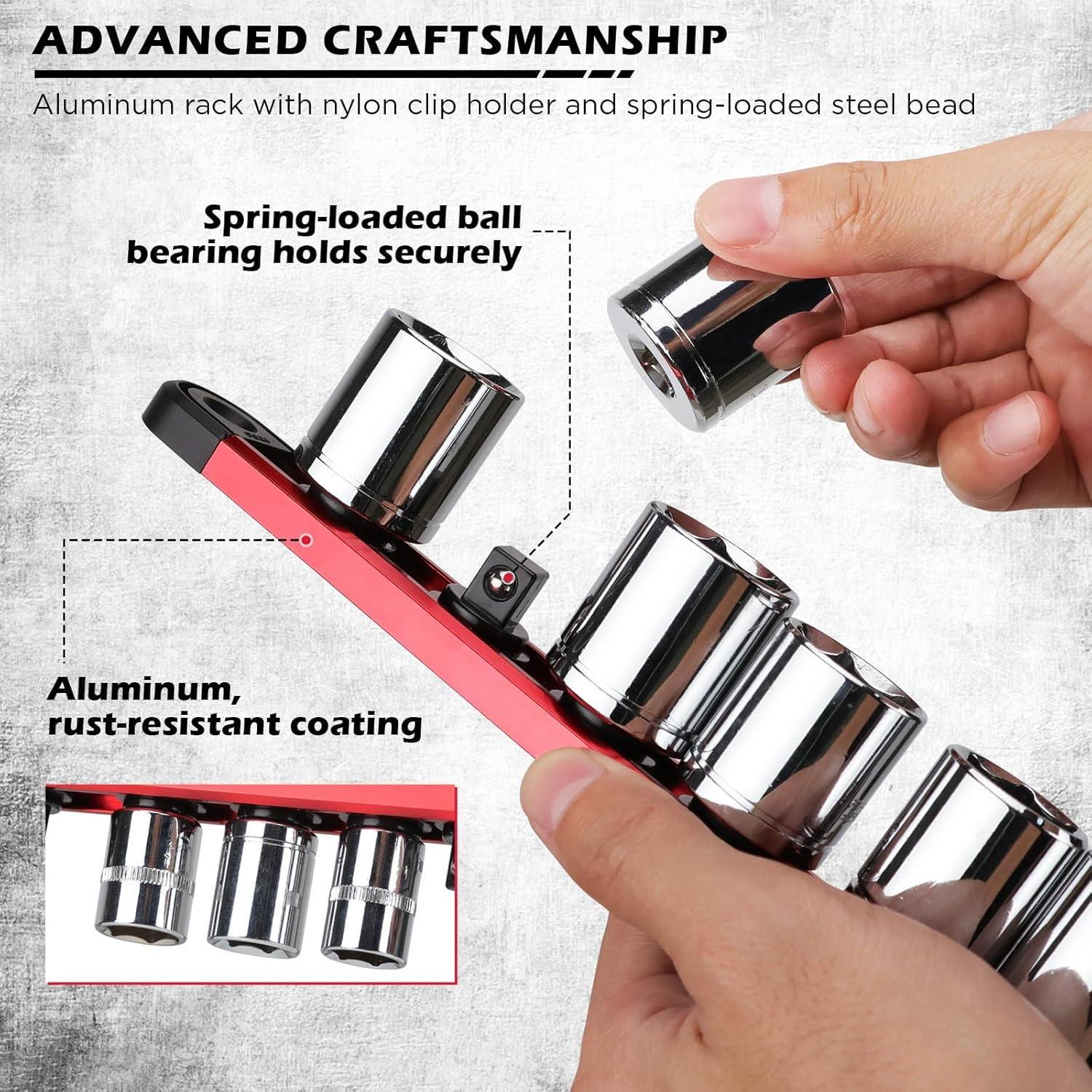 - SECURE GRIP - Featuring spring-loaded steel ball bearings and clip rail holder design, each socket snaps in place for impact-proof storage preventing accidental drops even when inverted, ideal for automotive accessories and workshops