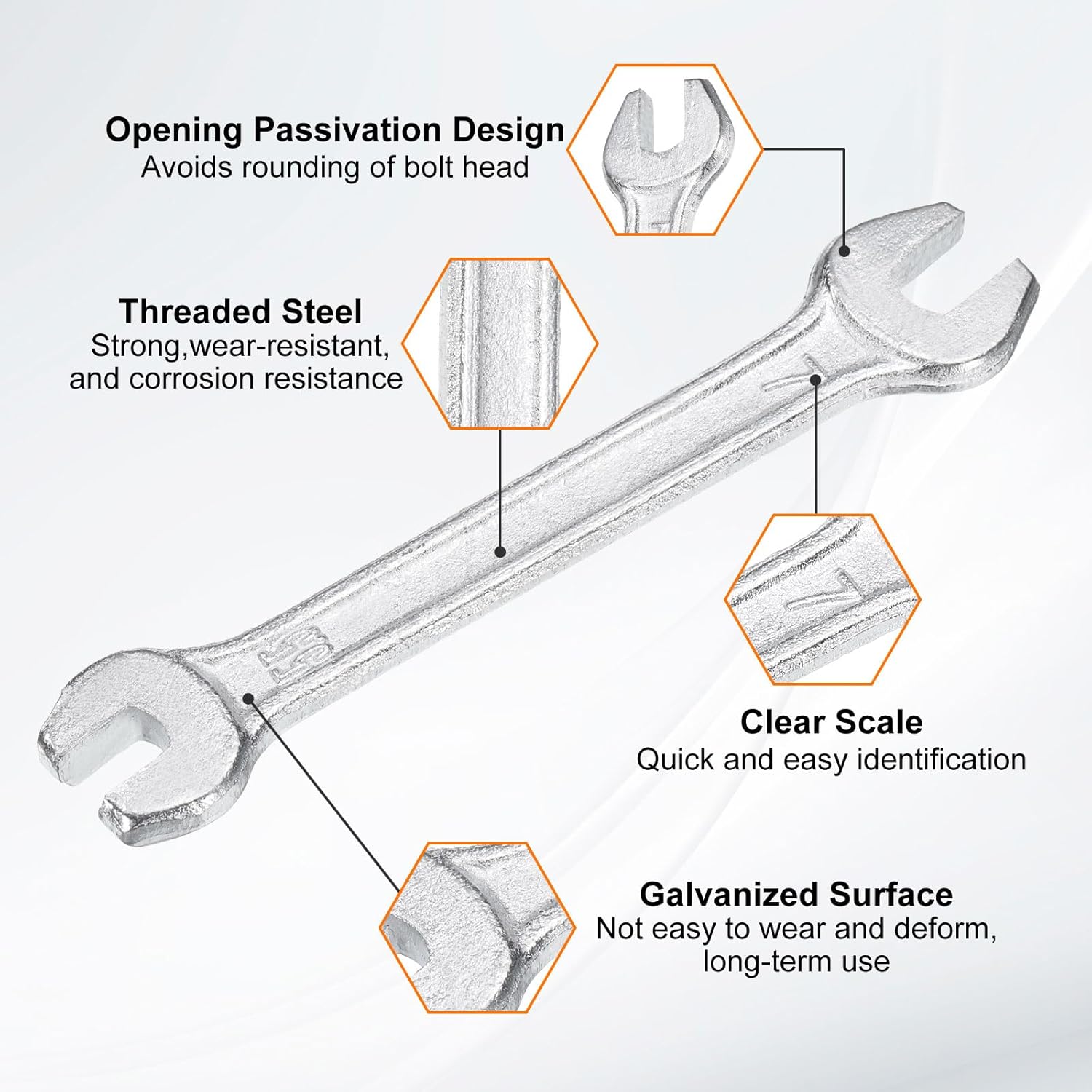 • Material - Our double open-end wrench is made of threaded steel with high hardness and excellent wear resistance. The surface galvanizing improves its wear resistance, keeps its surface smooth and reduces wear, is not easy to deform, and can be used for a long time.