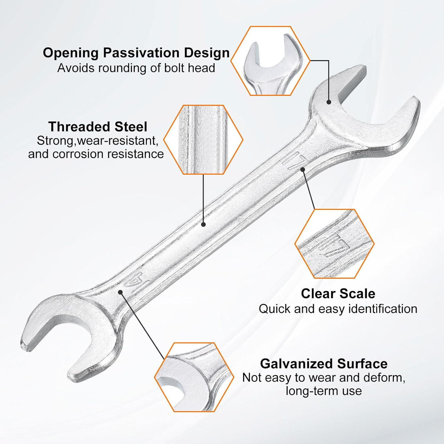 - Material - Our double open-end wrench is made of threaded steel with high hardness and excellent wear resistance. The surface galvanizing improves its wear resistance, keeps its surface smooth and reduces wear, is not easy to deform, and can be used for a long time.