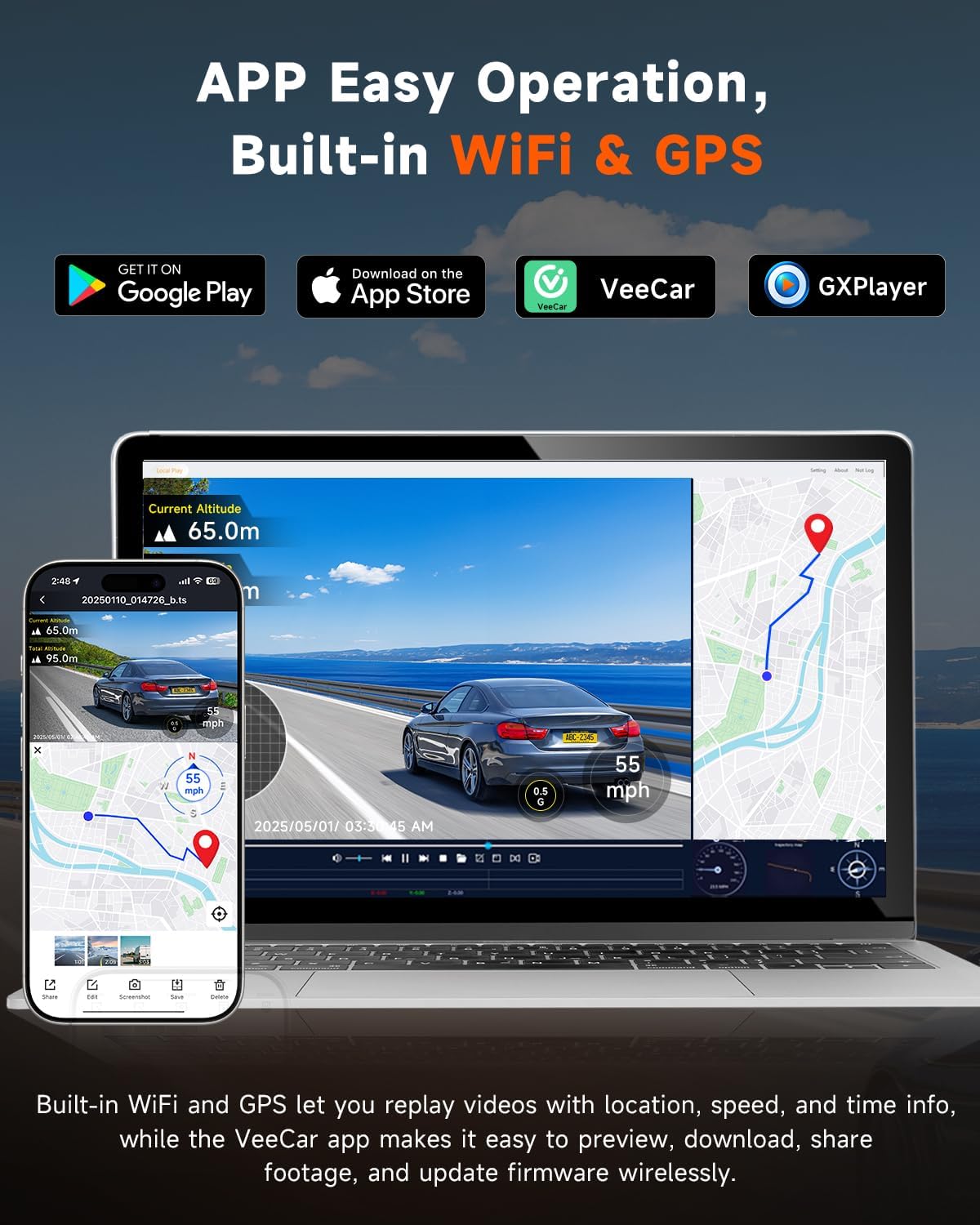 - 【Built-in WiFi & Smart GPS Logger — Easy Control, Reliable Tracking】Connect your smartphone via built-in WiFi to preview, download, and share videos instantly using the free VEECAR App. Adjust settings and manage storage easily on this dash camera for cars. The GPS logger records accurate location, routes, real-time speed (KM/H or MPH), and mileage, providing clear evidence for accidents, disputes, and insurance claims.