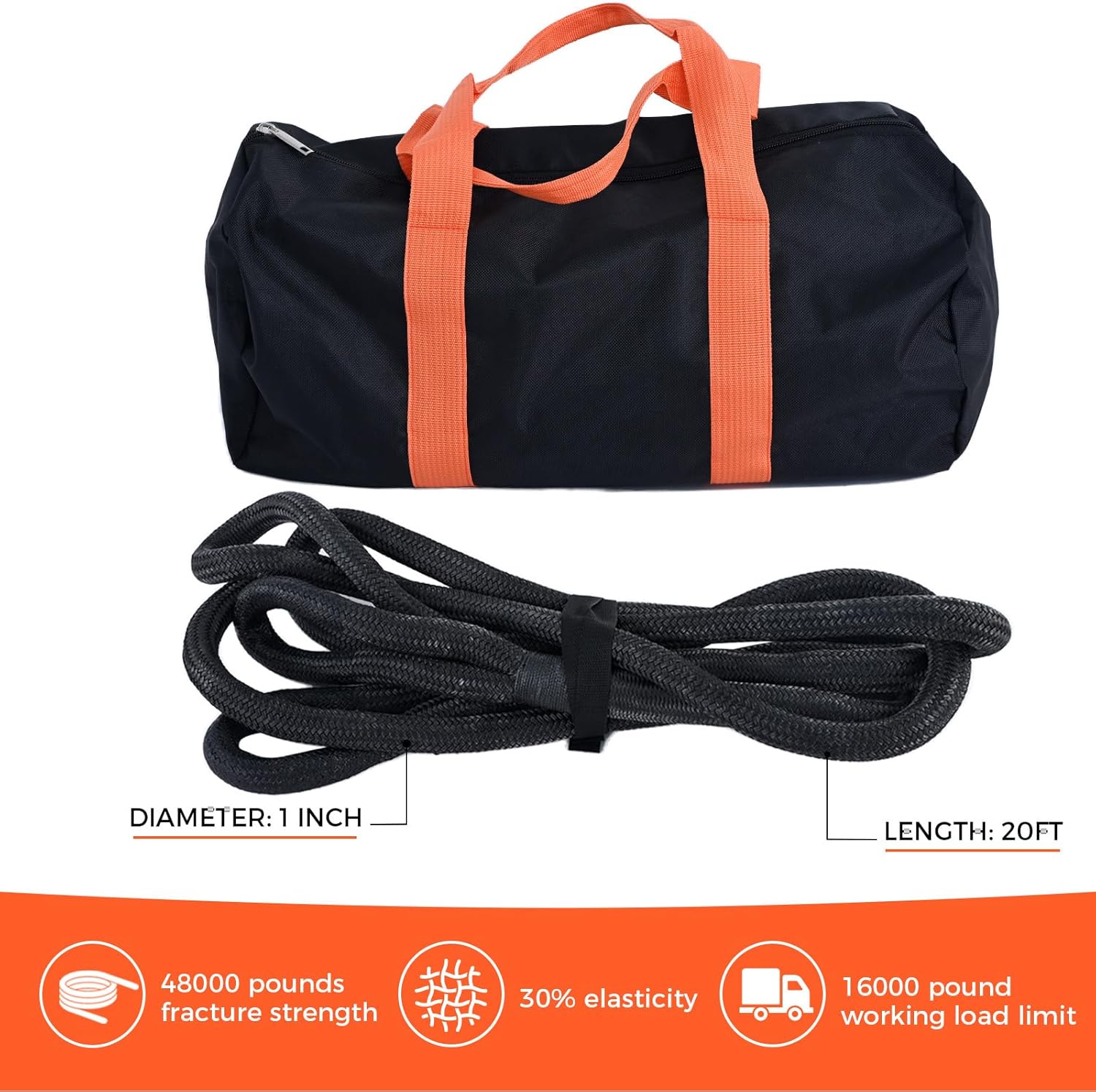 - PROFESSIONAL GRADE RESCUE ROPE: The 1 "x20ft kinetic recovery tow rope is made of 100% nylon and double braided construction for exceptional durability and reliability. With a breaking strength of up to 48,000 LBS and 30% elasticity to better prevent it from snapping during handling, it's an indispensable tool for towing, rescue, and other heavy-duty work in harsh environments.