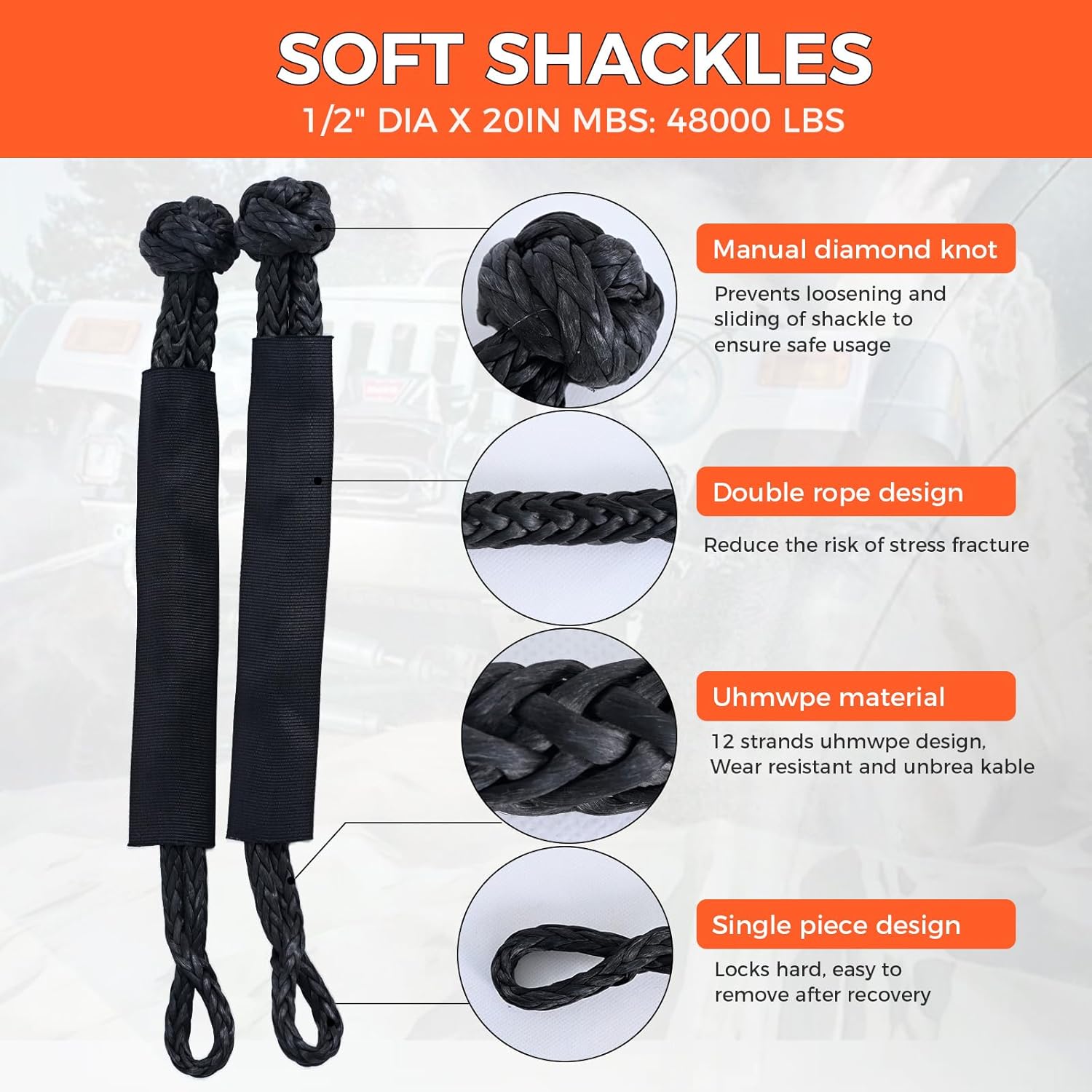 - TWO SOFT BUCKLES: The soft buckles are lightweight, compact and durable with a maximum breaking strength of 48,000 lbs. The outer sleeve enhances traction friction without wearing out the vehicle and protects the rope from abrasion. Features an ingenious self-tightening loop design that grips tighter under tension. Lighter weight than typical steel shackles on the market and won't sag, which improves operational efficiency.