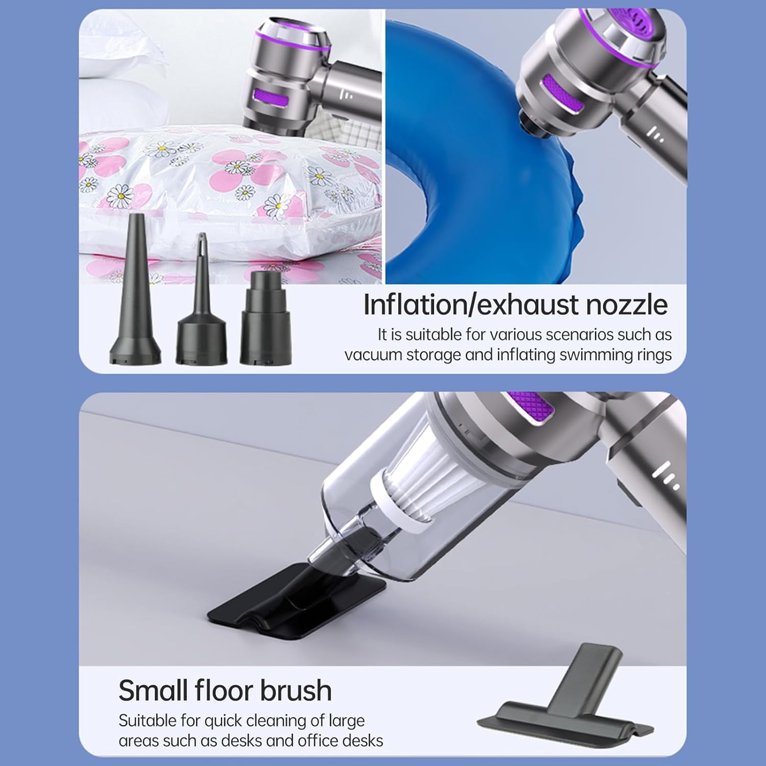 - ăVersatile 4-in-1 DesignăMore than just a vacuum cleaner, this car vacuum is equipped with a variety of accessories that can blow, vacuum and pump for a variety of scenarios, which is very helpful to reach small areas that a larger vacuum can't, it's perfect for removing dust, cleaning keyboards, inflating outdoor gear and deflating storage bags, anytime, anywhere.