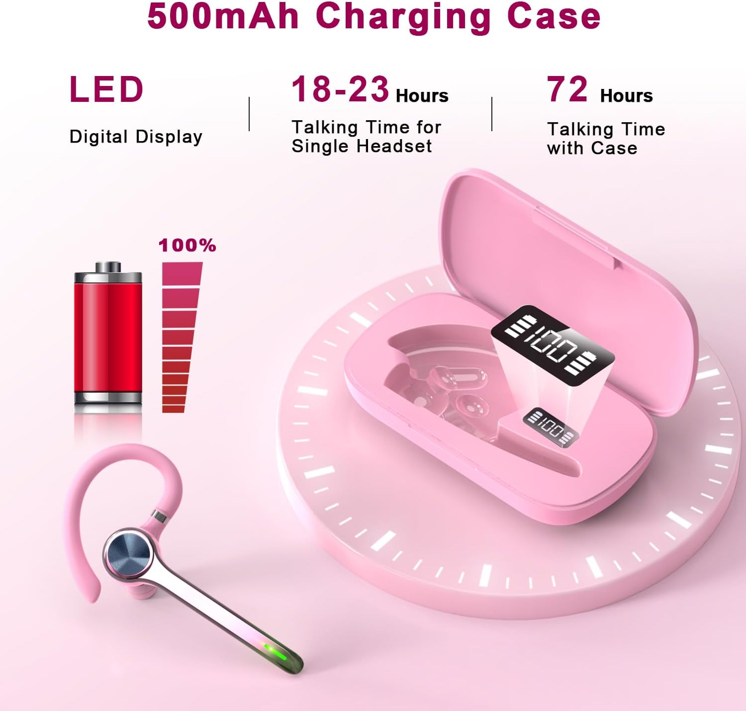 Bluetooth Headset, Wireless Bluetooth Earpiece with 500mAh Charging Case 72 Hours Talking Time Built-in Microphone for iOS Android Cell Phone, V5.1 Hand-Free Headphones for Trucker, Office-Pink