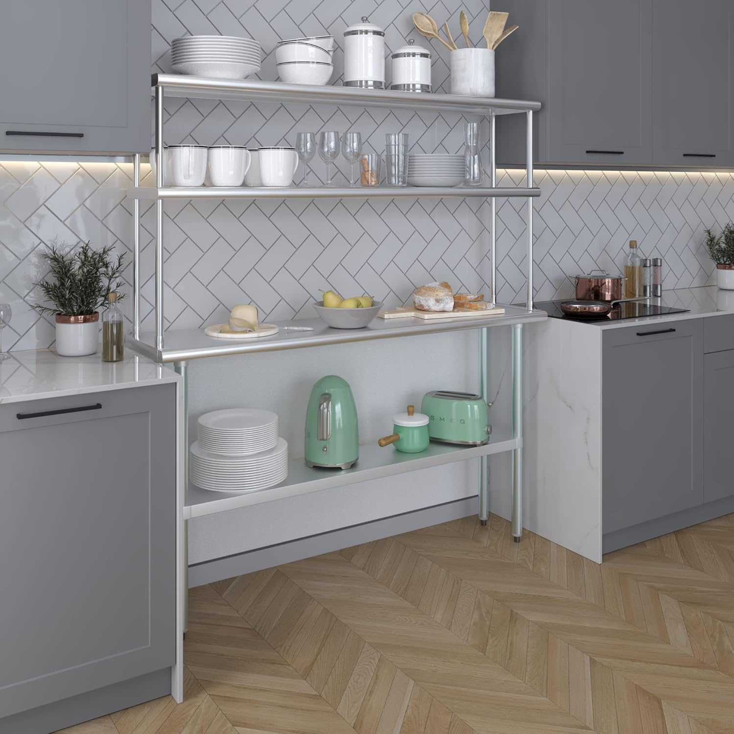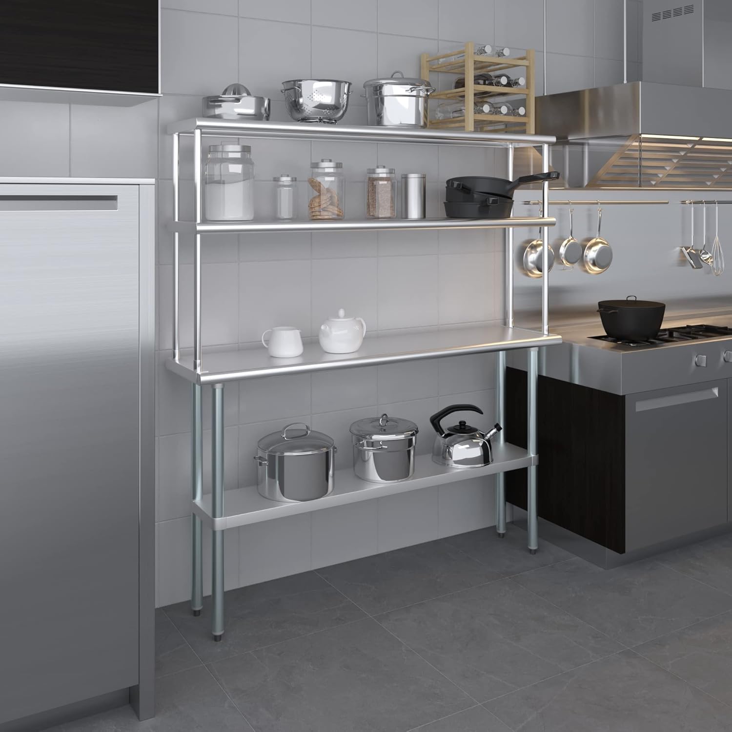 - WORK SAFETY: Work table top and double tier adjustable shelves are constructed from 18-gauge stainless steel, making this restaurant prep and serve table and double tier shelf combo set is durable and long lasting. The table top comes with a galvanized under-shelf for additional storage and adjustable legs for convenience. This table and shelf set is specifically designed and finished for use in a commercial or industrial setting, but is just as reliable in the home.