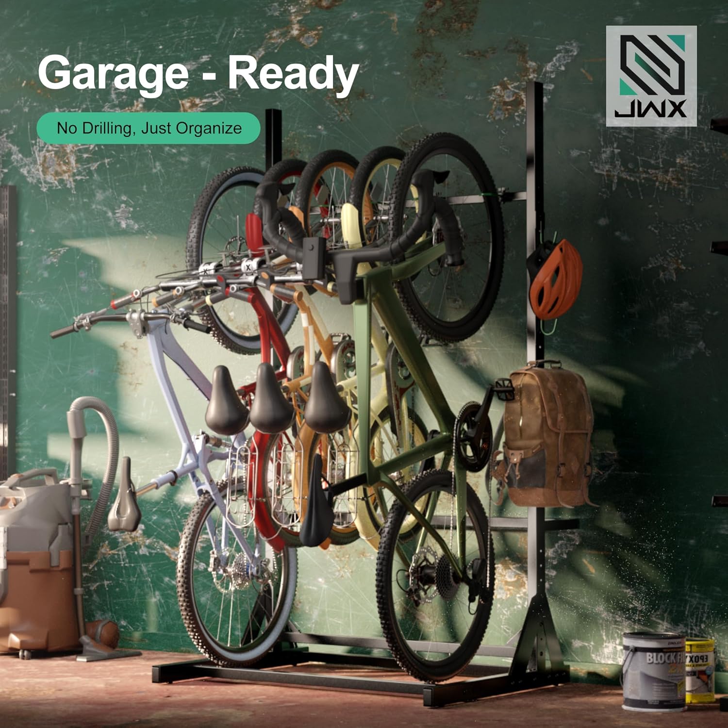 - Special Feature : Finally, we include a visual quick-start installation guide that reduces assembly time by up to 50%, a direct response to market feedback on poor instructions and over-complicated builds from competitor models., In addition, the entire steel frame is treated with an advanced coating, offering superior resistance to corrosion compared to traditional powder coatings â a feature especially valuable in high-humidity garages or outdoor-adjacent storage environments., The hook coating isn't just functional â it's branded. All JWX hooks are finished in our signature Morandi green rubberized material, delivering both visual identity and frame-safe performance. This signature coating also extends to the two integrated accessory hooks located on each side panel, designed specifically for hanging helmets, hydration packs, and cycling tools, all while protecting your gear from abrasion or damage., To further enhance flexibility, JWX developed a precision-adjustable hook spacing system. Each bike hook is mounted on a sliding rail with lockable tension screws, allowing users to customize the distance between bikes to prevent handlebar interference â especially useful for accommodating wide or asymmetrical handlebars found on e-bikes, fat tire bikes, and kids' bikes., Unlike typical freestanding bike racks, the JWX Freestanding 5 Bike Rack features a proprietary dual-triangle support structure on both sides â an engineering breakthrough inspired by architectural principles to deliver superior load-bearing capacity and enhanced lateral stability. This structural innovation means the more bikes you add, the more stable the rack becomes â an inversion of traditional design weaknesses. Finally, we include a visual quick-start installation guide that reduces assembly time by up to 50%, a direct response to market feedback on poor instr⊠See more
