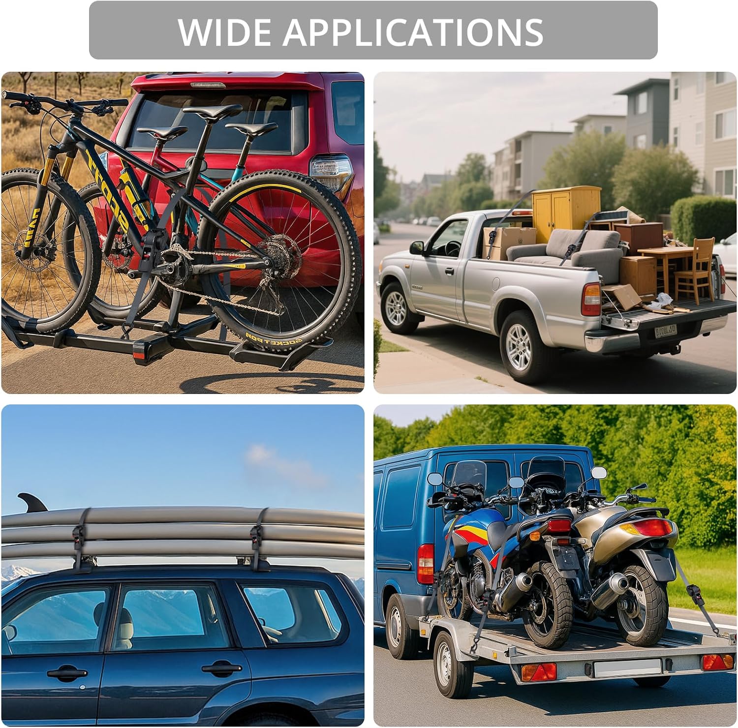 - 【Wide Applcations】Versatile ratchet straps are designed to quickly and securely transport motorcycles, furniture, ladders, boats, and other bulky items by truck, trailer, or van. The included storage bag can store your straps when not in use, while 4 soft loops make securing irregular-shaped objects effortless. Whether you're a professional mover or a ordinary household user, these straps adapt to all your cargo needs