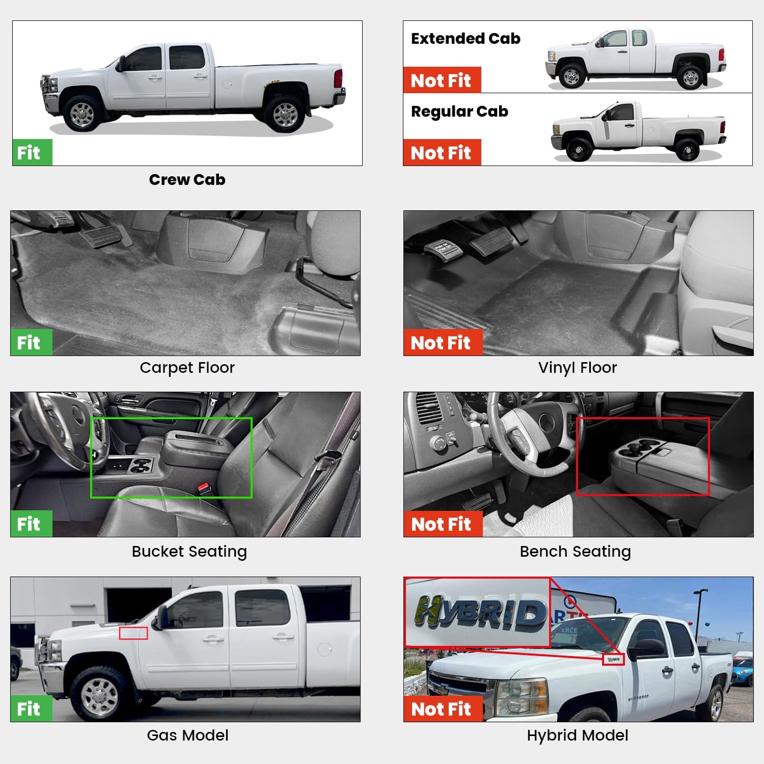 - ăCustom FităLASFIT floor mats perfectly fit for Chevrolet Chevy Silverado/GMC Sierra 1500 2007-2013 (Fit Gasoline, Not Fit Hybrid) Only Crew Cab (Not Fit Regular Cab/Double Cab), for Chevrolet Silverado/GMC Sierra 2500HD 3500HD 2008 - 2014 Crew Cab, Only Bucket Seat, with Carpet Floor (Not Fit Vinyl Floor).