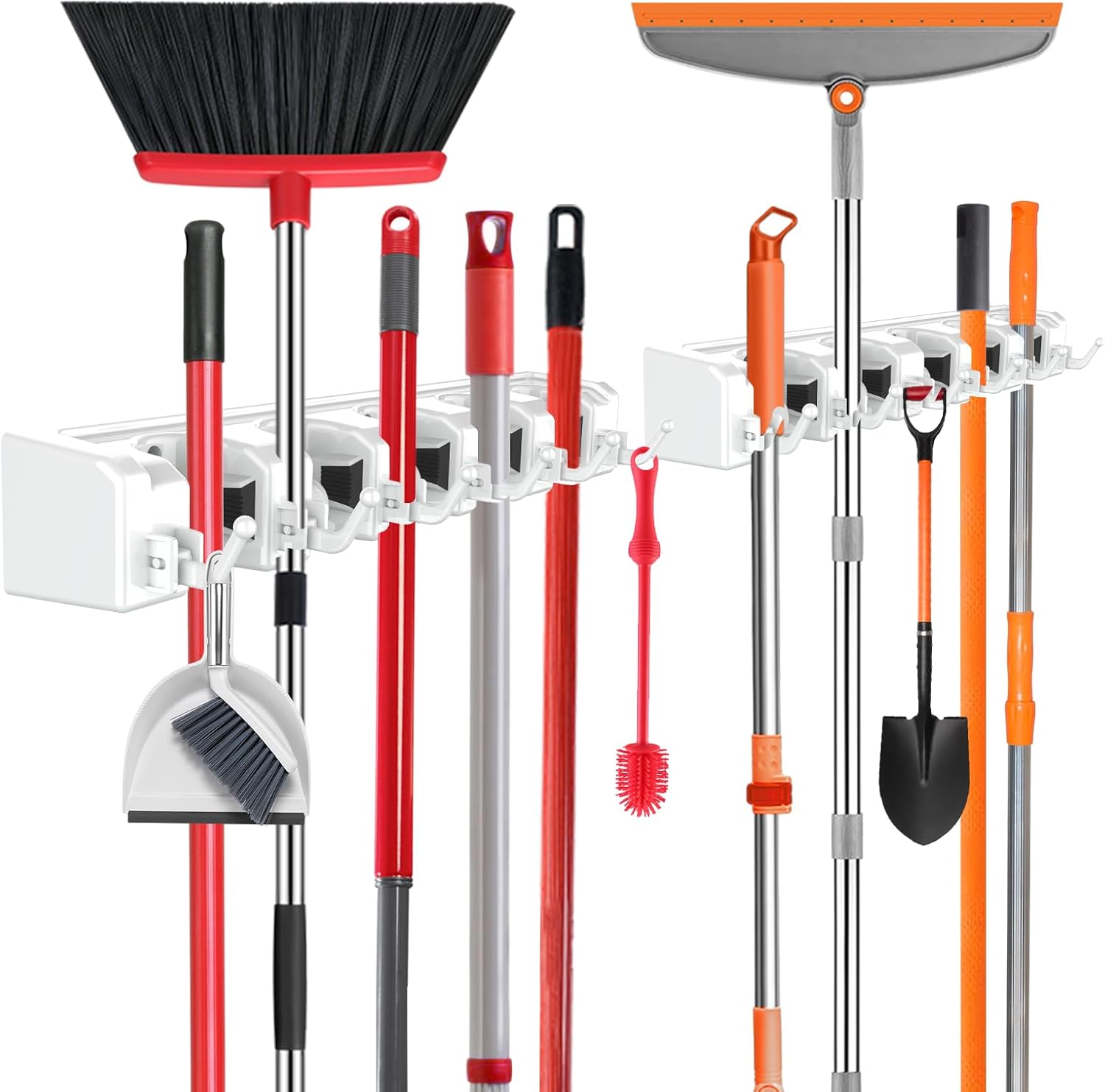- CLEANING TOOLS STORAGE RACK: This wall mounted broom rack is suitable for storing cleaning supplies, gardening tools, kitchen utensils and hardware tools. Our broom rack is the best companion for your kitchen, garage, laundry room, keeping your work area clean and tidy