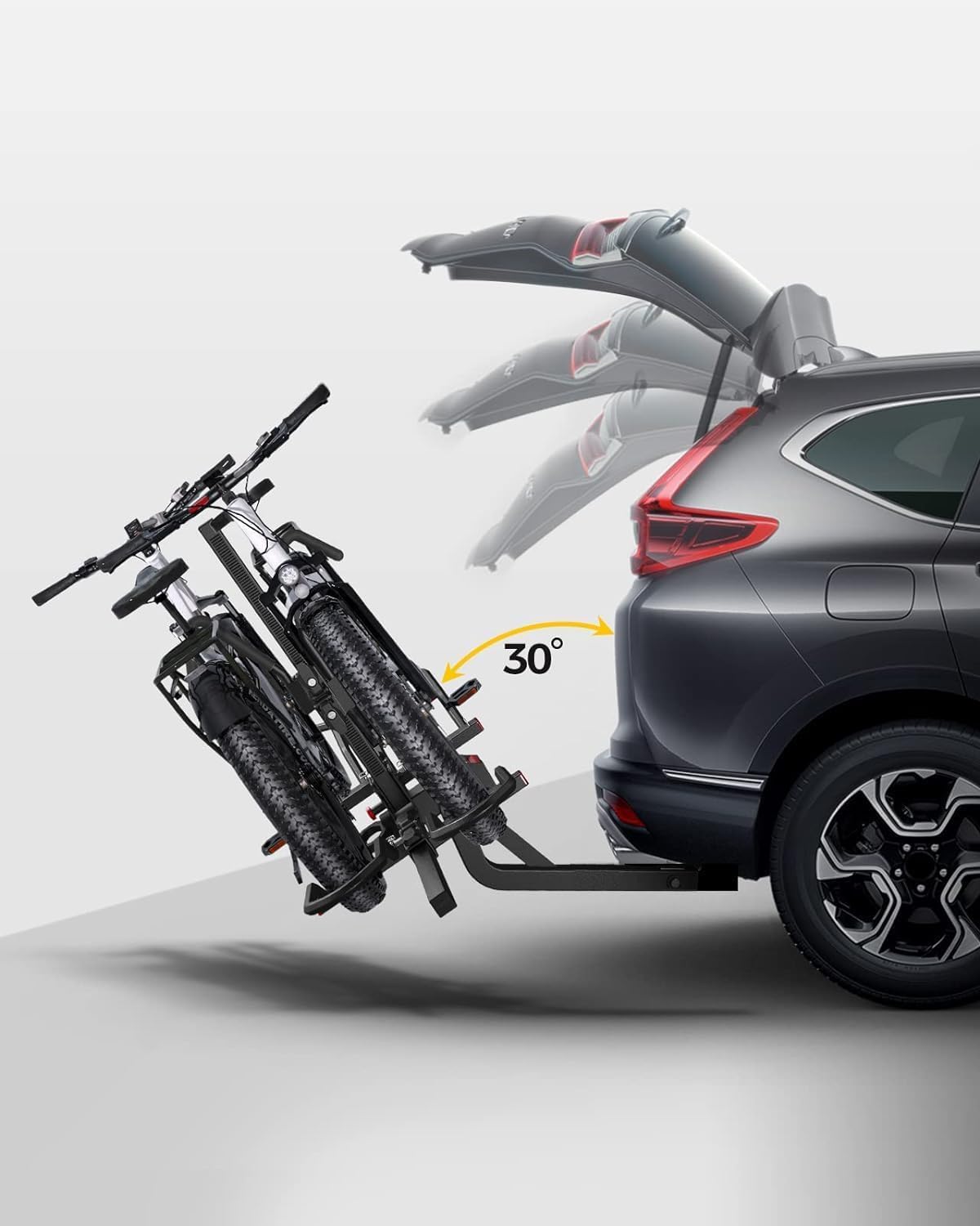 - ăConvenient Tilt and Fold FunctionăEasily tilt the rack down with a quick-release handle for hassle-free access to your trunk without removing the rack. Foldable design saves space when not in use, making it perfect for storage or garage parking.