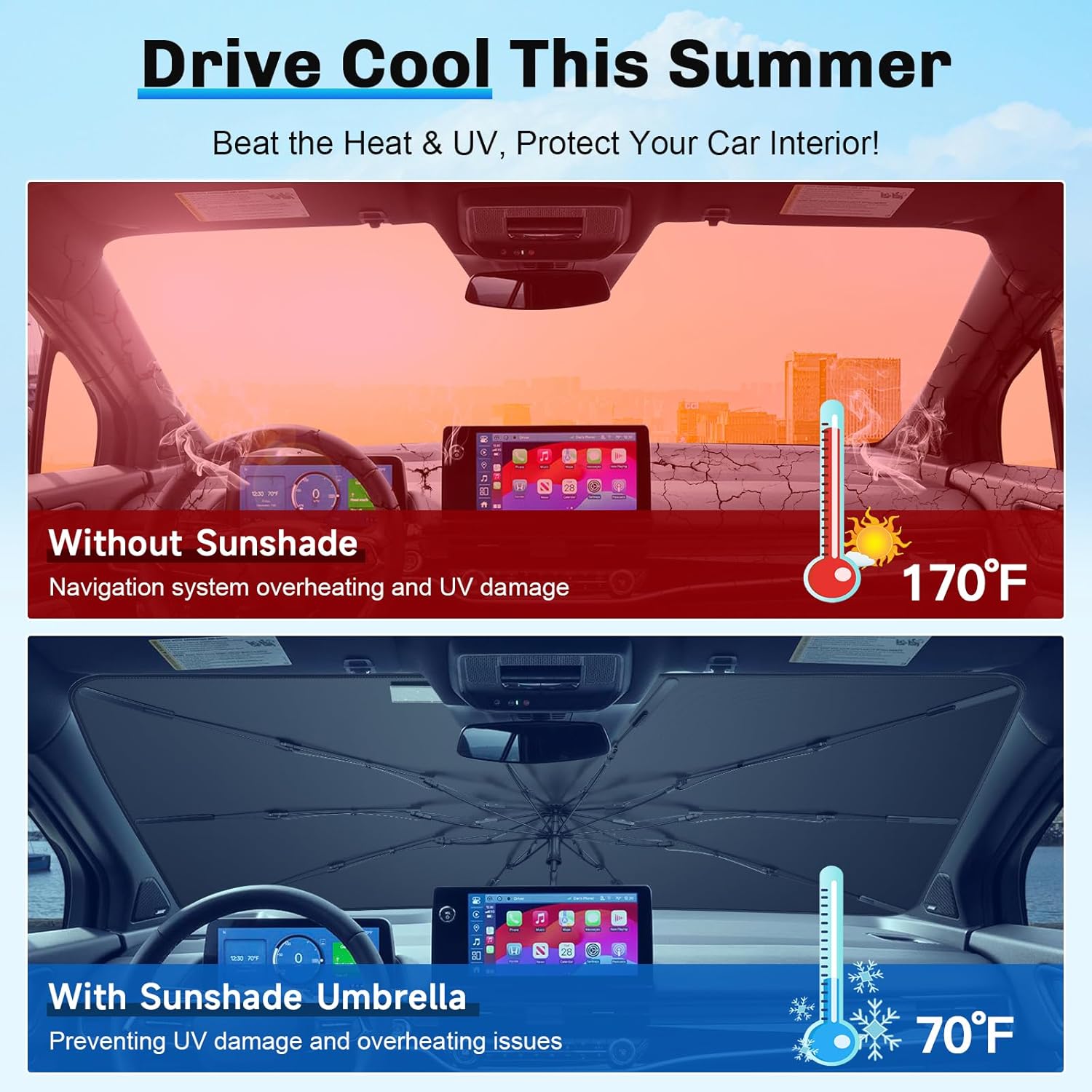 - 3. Enhanced Durability and Stability: Our 2024 2025 Prologue Windshield Umbrella uses 10 glass fiber ribs for high strength, heat resistance, and anti-rust performance. Silicone strips withstand 200ยฐC, ensuring durable shade and interior protection