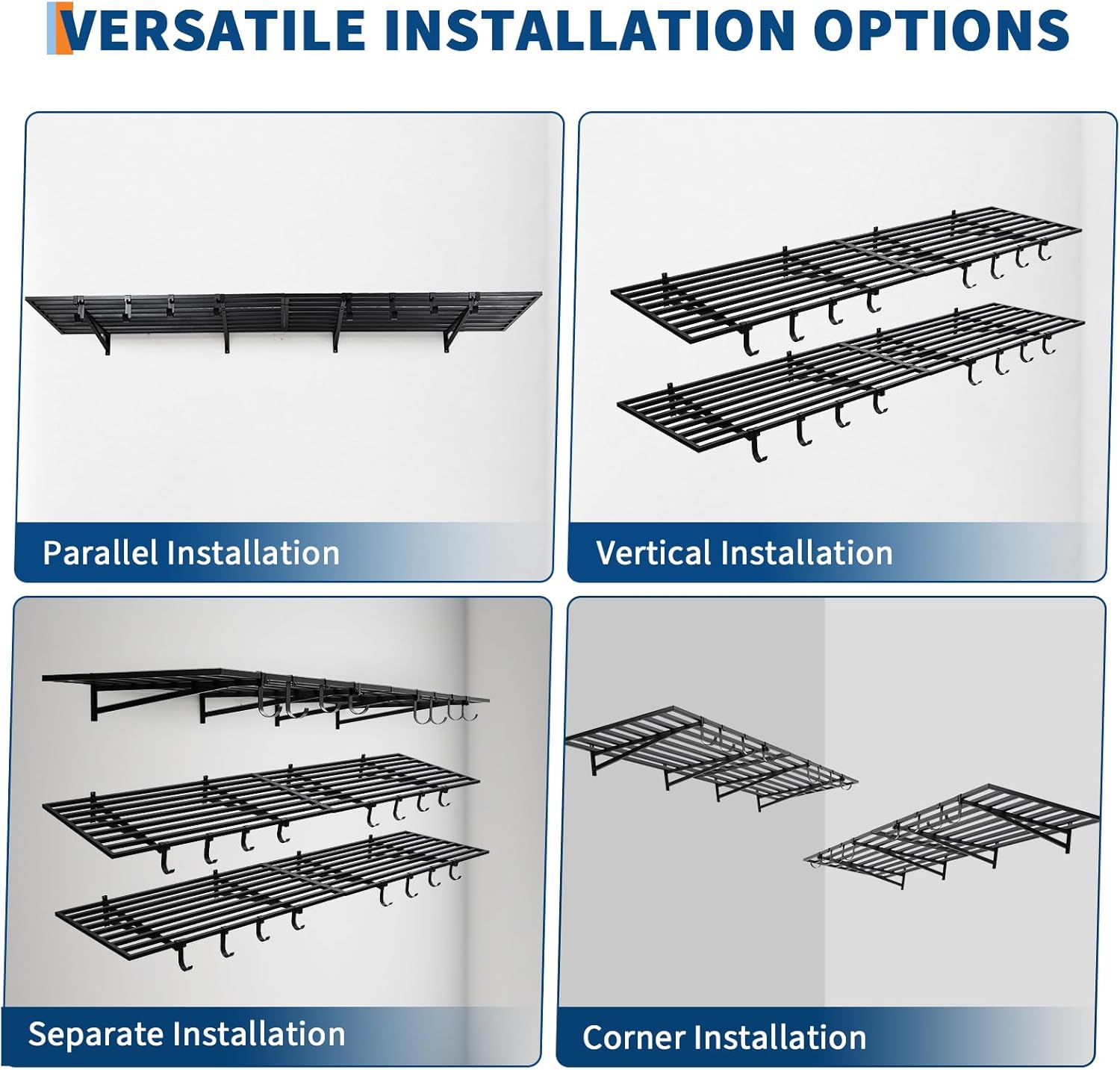 - STRONG AND STABLE: Made from solid steel square tubing, each 2' x 4' wall-mounted shelf holds up to 200 pounds. Two shelves combined hold up to 400 pounds, providing exceptional strength and durability for reliable organization in your garage.