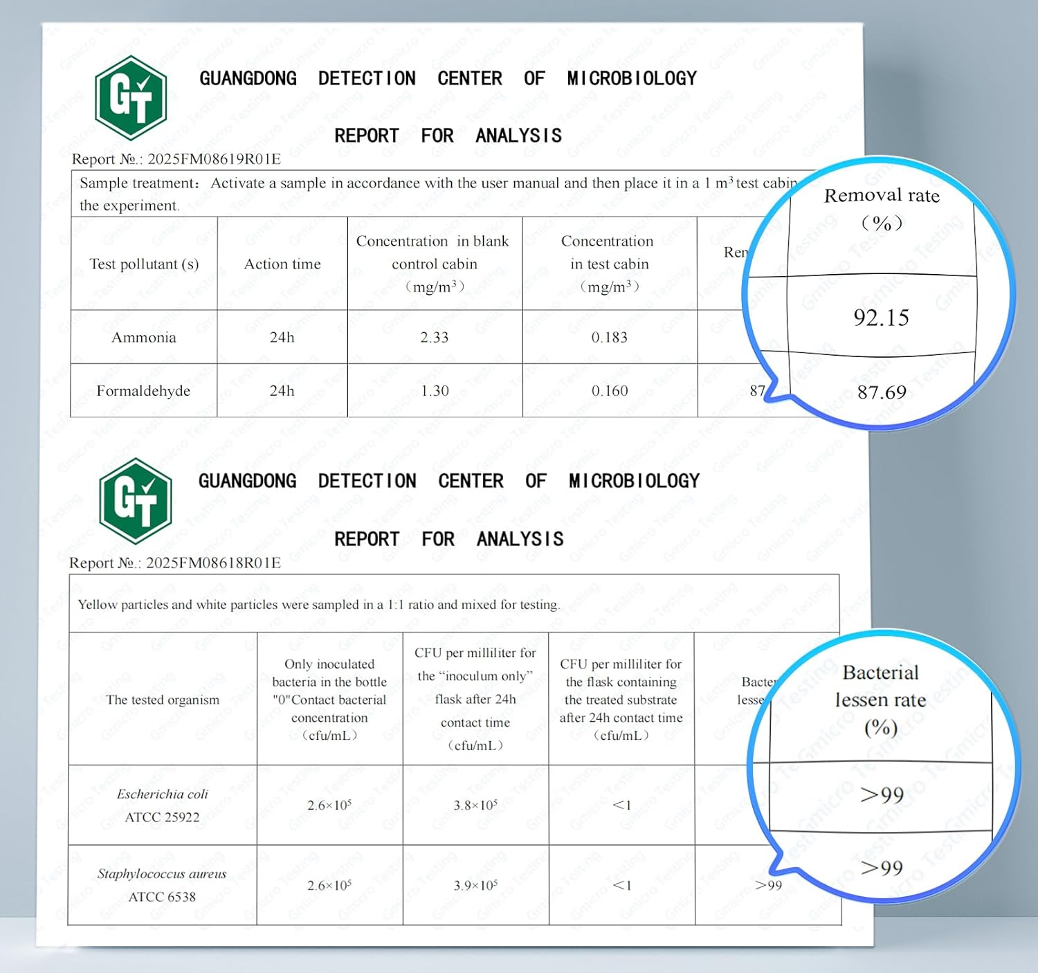 - Active Odor Elimination: Unlike active charcoal and baking soda which eliminate odors through adsorption, our unscented product actively decomposes odor molecules to suppress the generation of unpleasant odors. According to professional test institution testing, our product removes 92% of ammonia and 87% of formaldehyde within 24 hours.