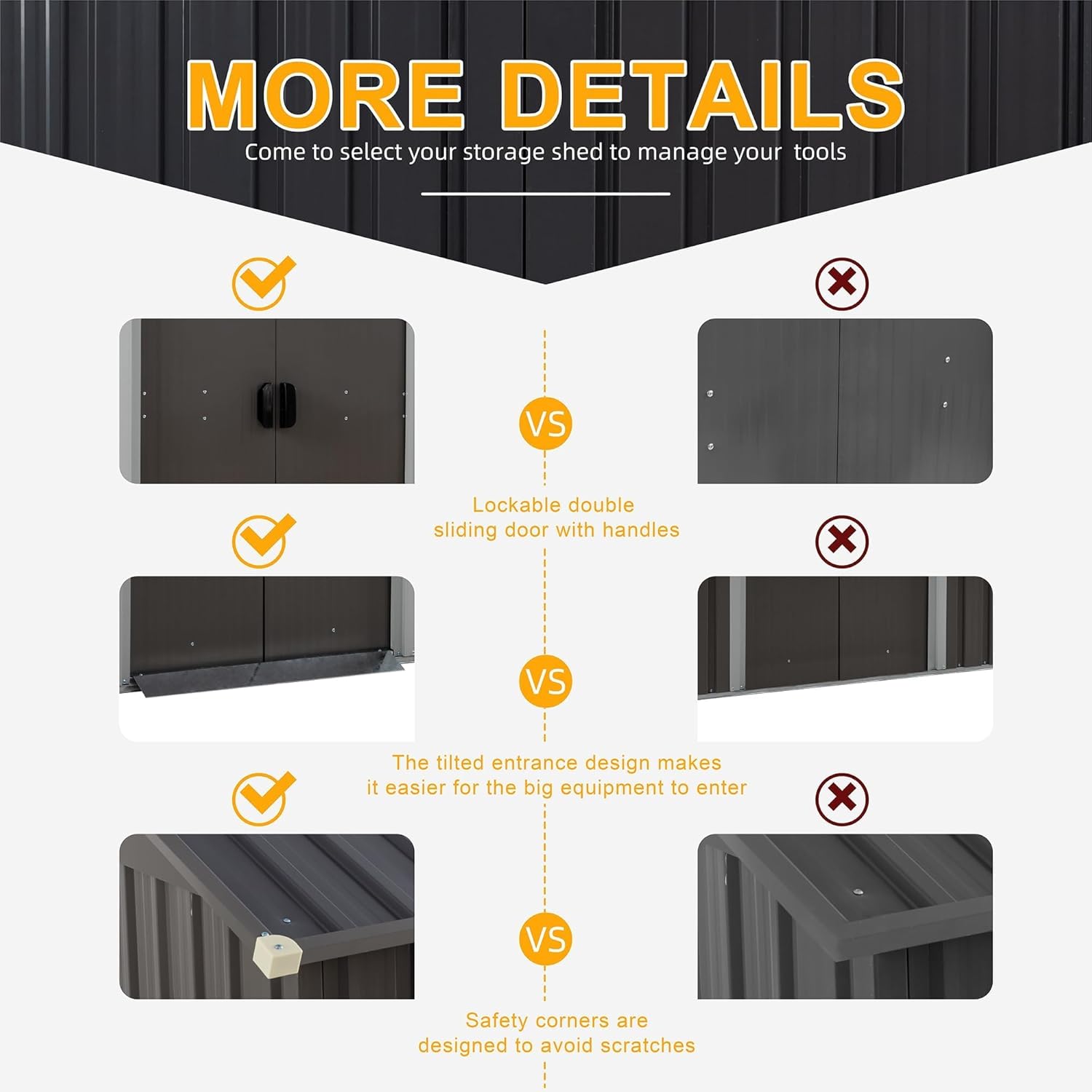 - 【Secure and Lockable】The garden shed's lockable doors safeguard your belongings, preventing theft and unauthorized access. Compatible with locks,it offers reliable security and peace of mind for your tools and items.