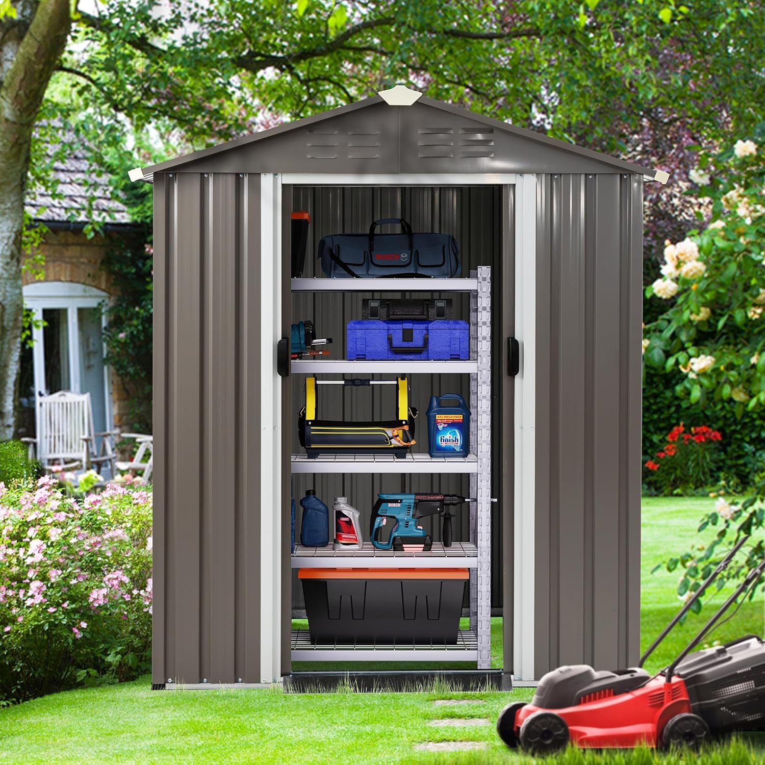 - 【Spacious Storage】This outdoor metal shed offers ample storage for tools,lawn mowers,bicycles,BBQ grills,and more.Its large capacity keeps your yard tidy and meets diverse needs,even doubling as a pet shelter or greenhouse.Stay organized effortlessly.