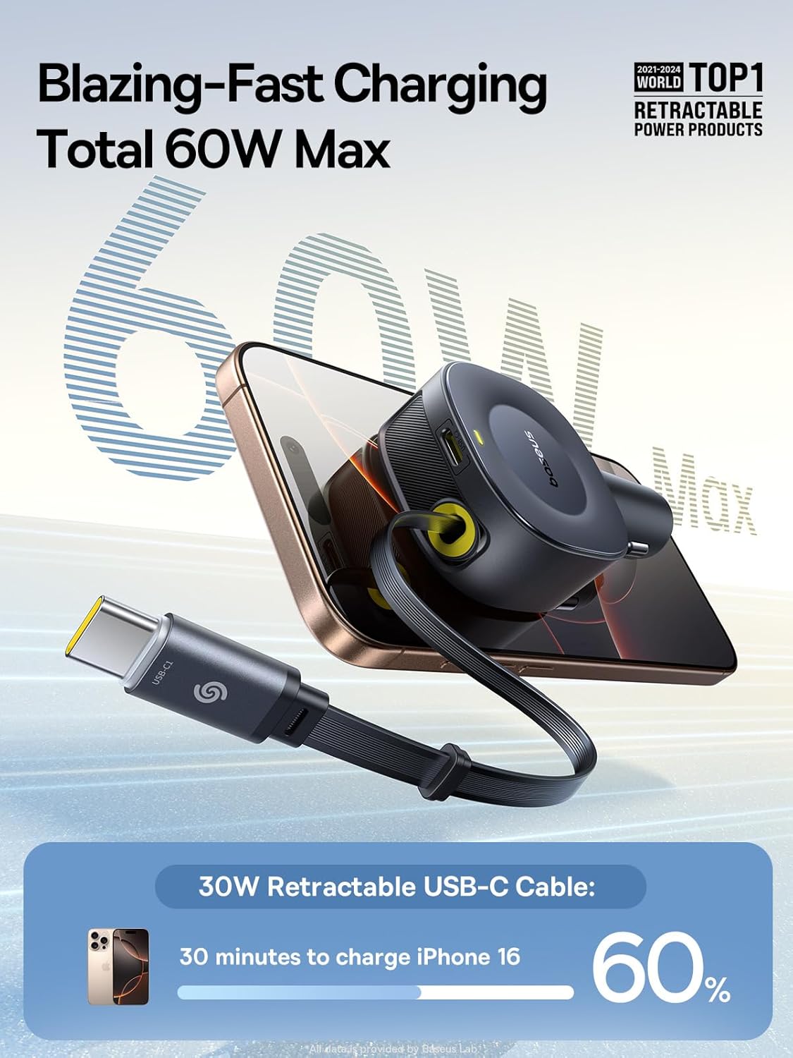 Baseus Ultra-Mini Retractable Car Charger USB C, 60W Fast Charging Car Charger with Retractable USB C Cable for iPhone 16 15 14 Pro Max, Samsung Galaxy S25 Ultra, Android, iPad, AirPods